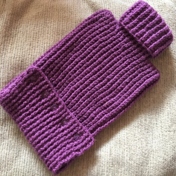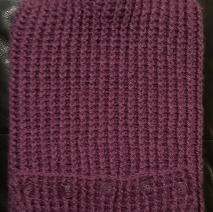 Crocheted purple/mauve, the cover has a pretty ribbed pattern and a roll neck which has been left open so there is no need to remove the cover to fill with water.