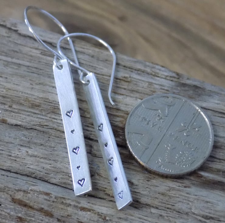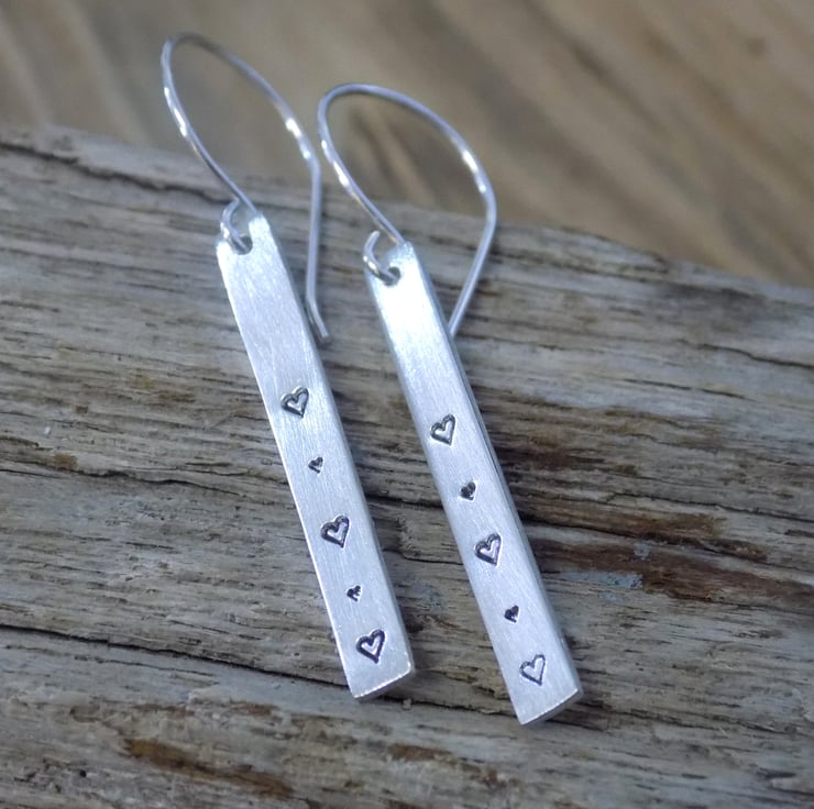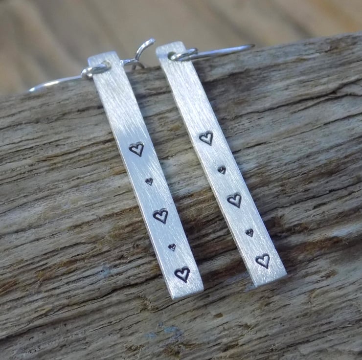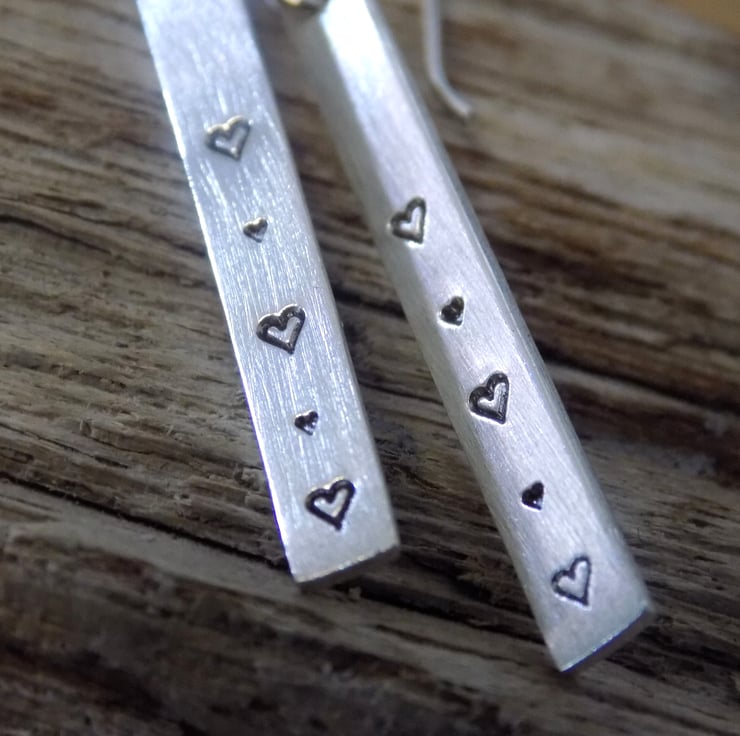Made from 1mm thick sterling silver sheet, simply shaped into long rectangles measuring 3cm and stamped with tiny hearts and given a brushed satin finish. Hung from hand made sterling silver French hooks.