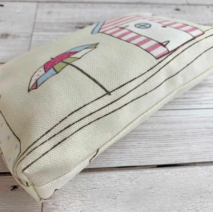 This large purse could be used as a coin purse and is large enough for bank cards and keys. It is also large enough to be used as a small make up bag or as a mobile phone pouch. The purse, with its beach theme and pastel colours would make a lovely gift, particularly for anyone who loves beach huts.
