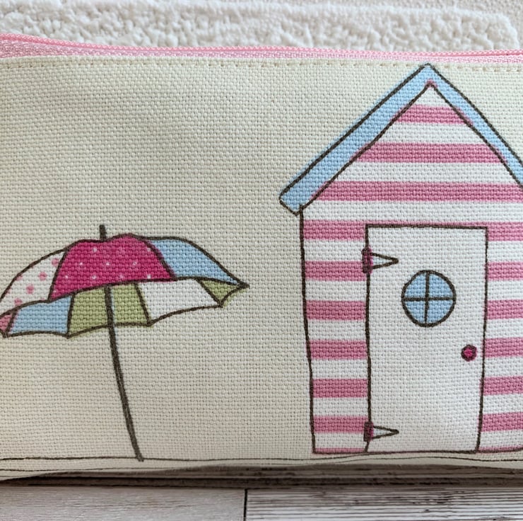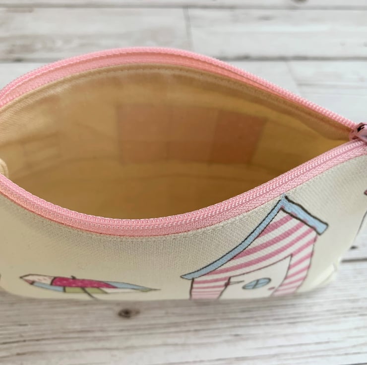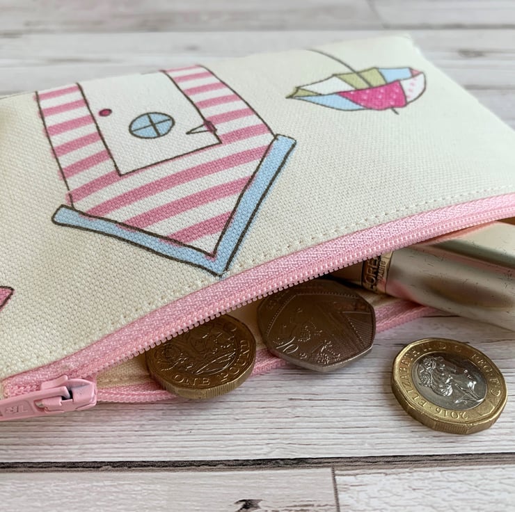 A lovely large coin purse in delightful pastel-coloured beach themed fabric. The pattern, in pastel shades of pink, white, blue and green on a cream background, features a beach hut with a parasol next to it. The beach hut is pink and white striped with a pale blue roof and a white door with a little round window. The coin purse fastens with a co-ordinating pale pink zip and is lined with cream fabric. The base of the purse is boxed to give a spacious interior.