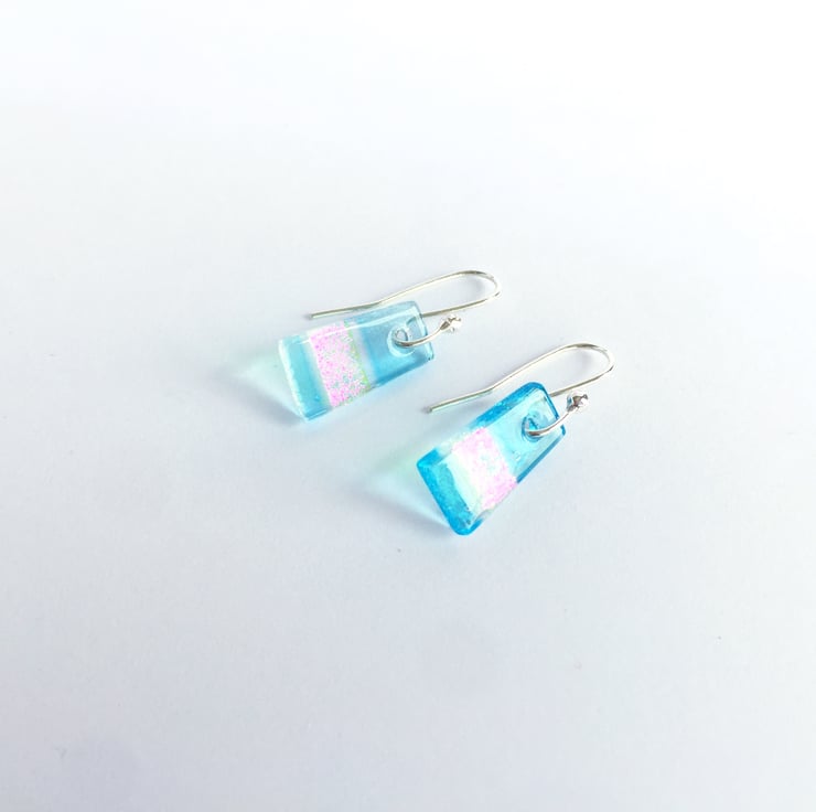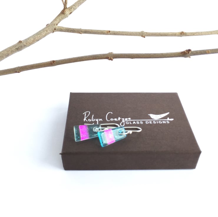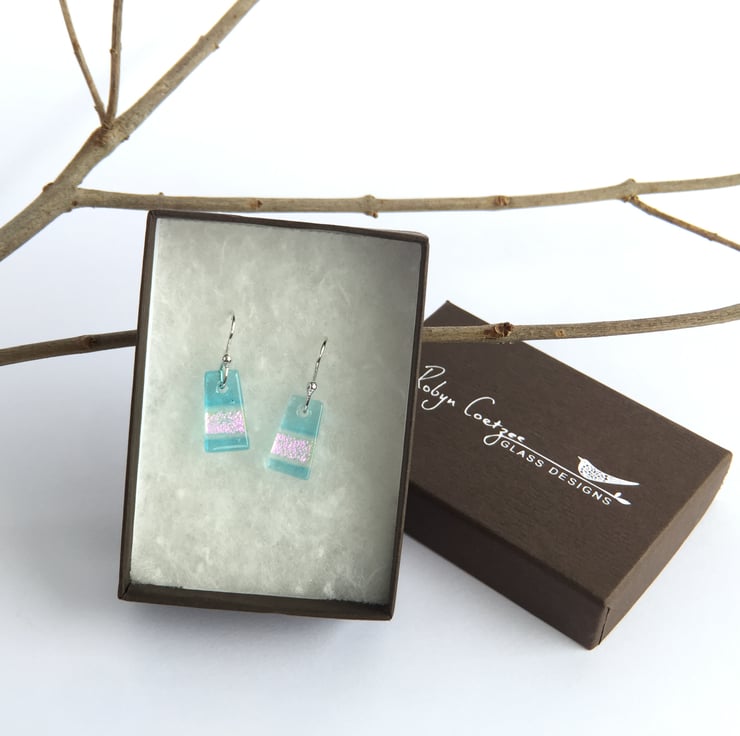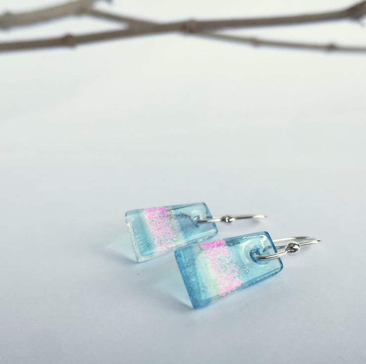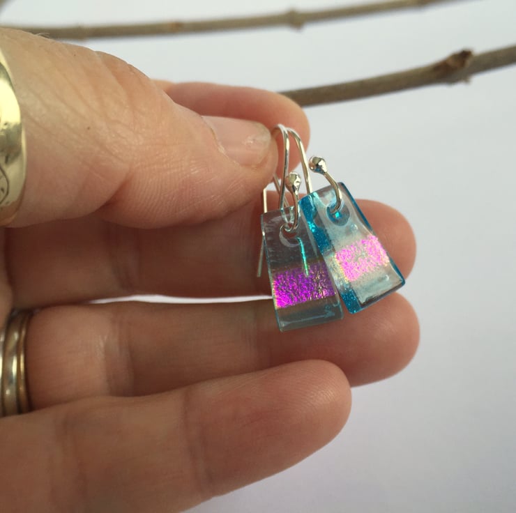 This listing is for a pair of pretty turquoise and pink dichroic glass earrings on sterling silver ear hooks. Both the glass and sterling silver hooks have been made by myself.