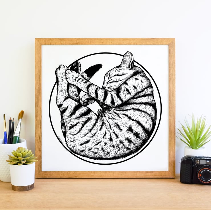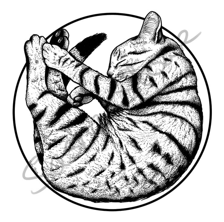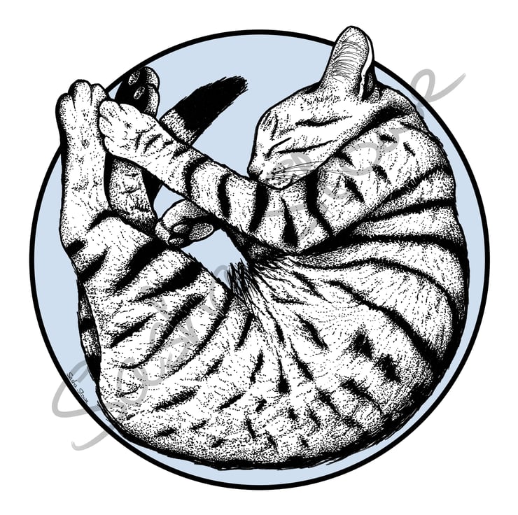 An adorable little illustration of a sleeping tabby cat. The original illustration was done using fine-liners and the stippling technique to show tonal variation. The colour version has had the colour added digitally. If there is a different background colour that you would prefer, then please get in touch as I can change the colour to suit.