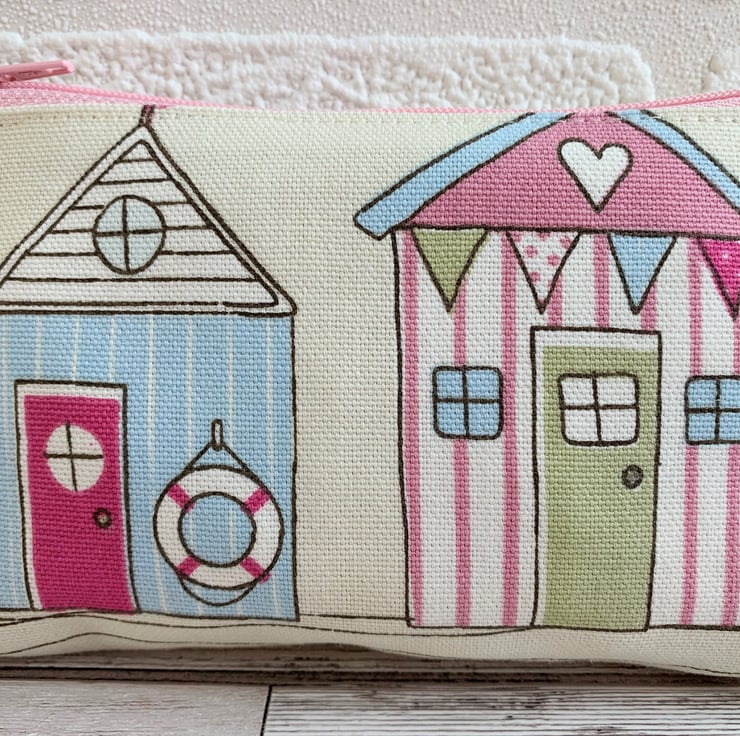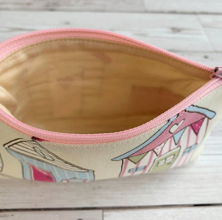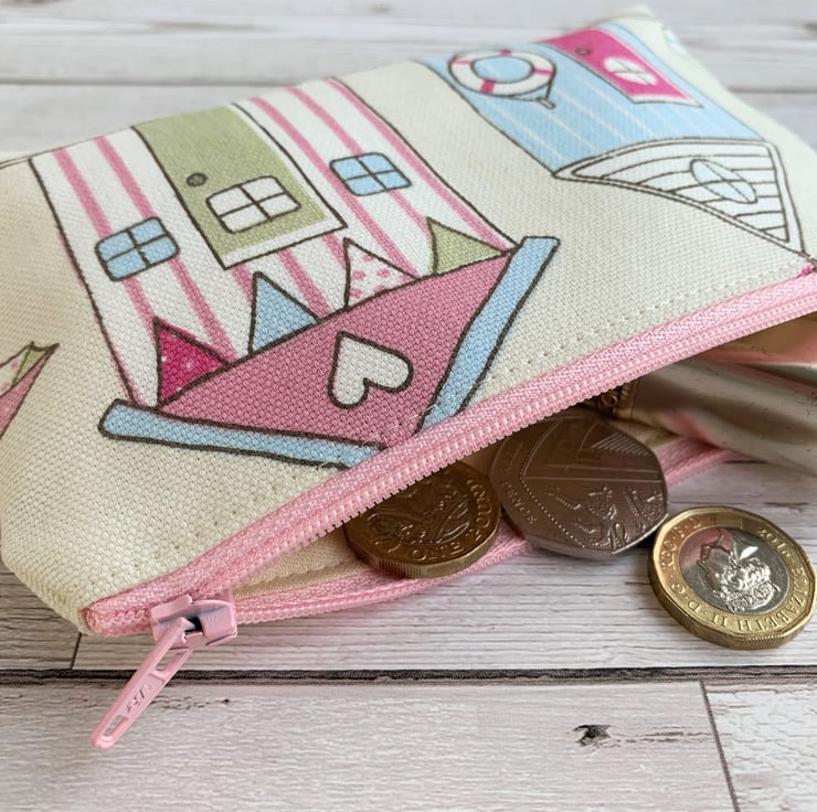 A lovely large beach huts coin purse in pretty pastel-coloured fabric. The pattern features two striped beach huts in pastel shades of pink, pale green, pale blue and white on a cream background. There is a pale pink and white striped hut with a green door and a pale blue and white striped hut with a pink door. One hut is decorated with bunting and one has life belt hanging from a hook. The coin purse fastens with a co-ordinating pale pink zip and is lined with cream fabric. The base of the purse is boxed to give a spacious interior.