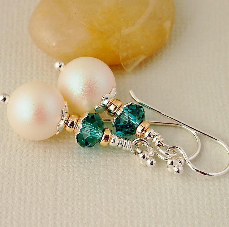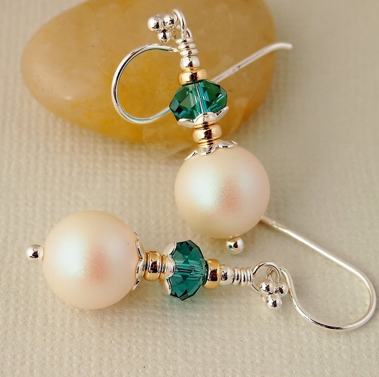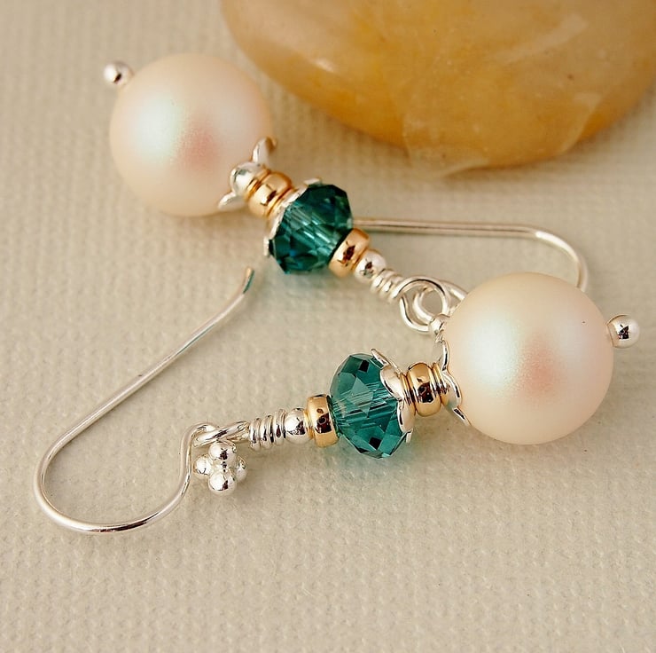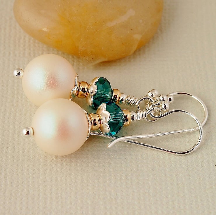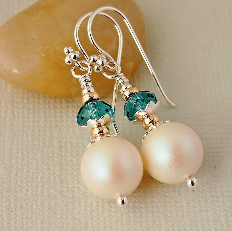 Handmade earrings featuring Swarovski glass pearls in Pearl White, a very pretty iridescent white with hints of blue and pink, topped with Indicolite Swarovski rondelles with sterling silver bead caps and gold filled accent beads.