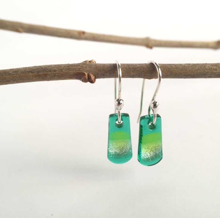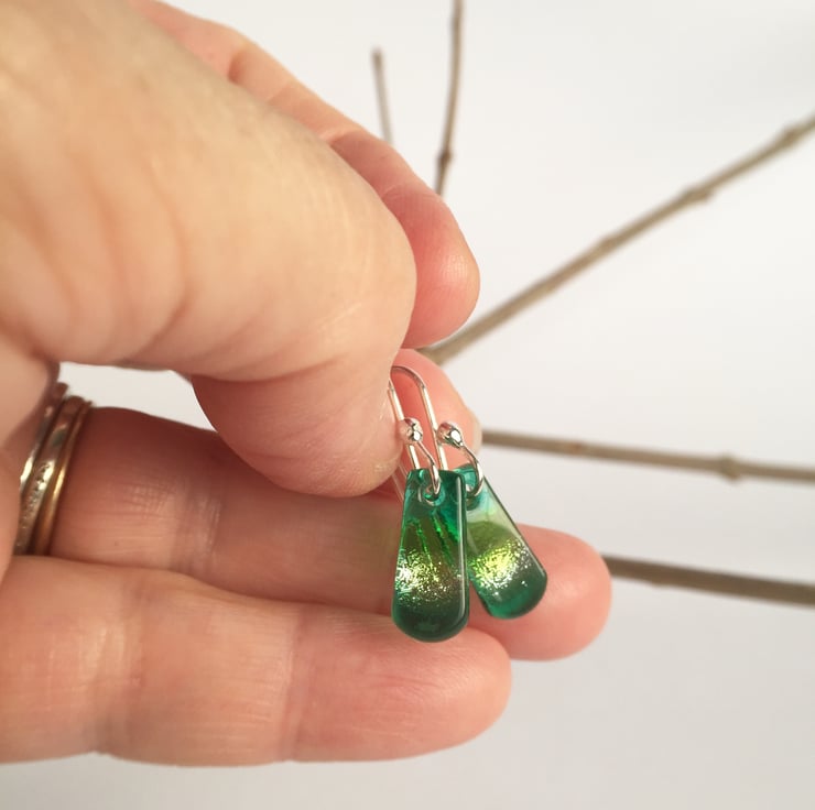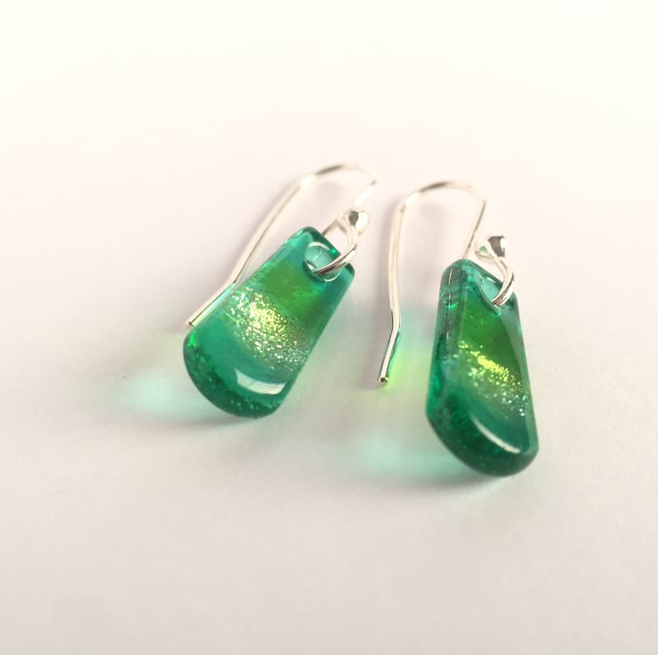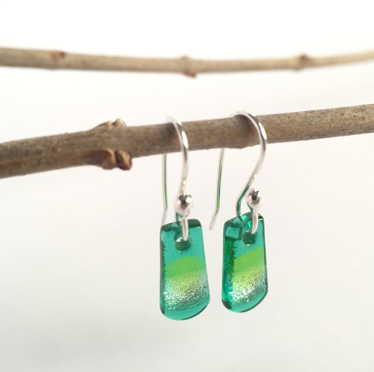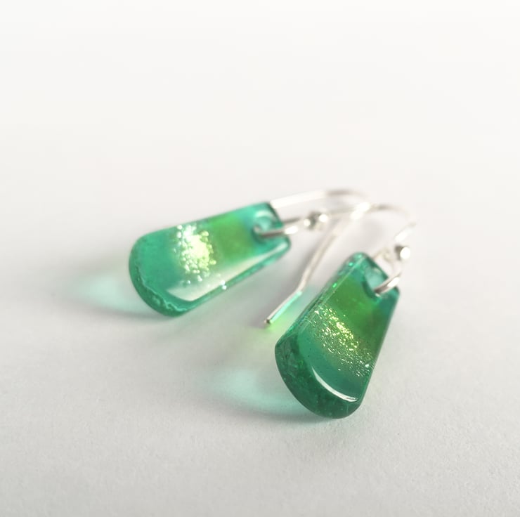 These pretty little dangles are a lovely mix of jade green and spring green, overlaying a bit of the silver dichroic which catches the light beautifully. True flashes of delight. Very hard to capture how pretty these actually are.