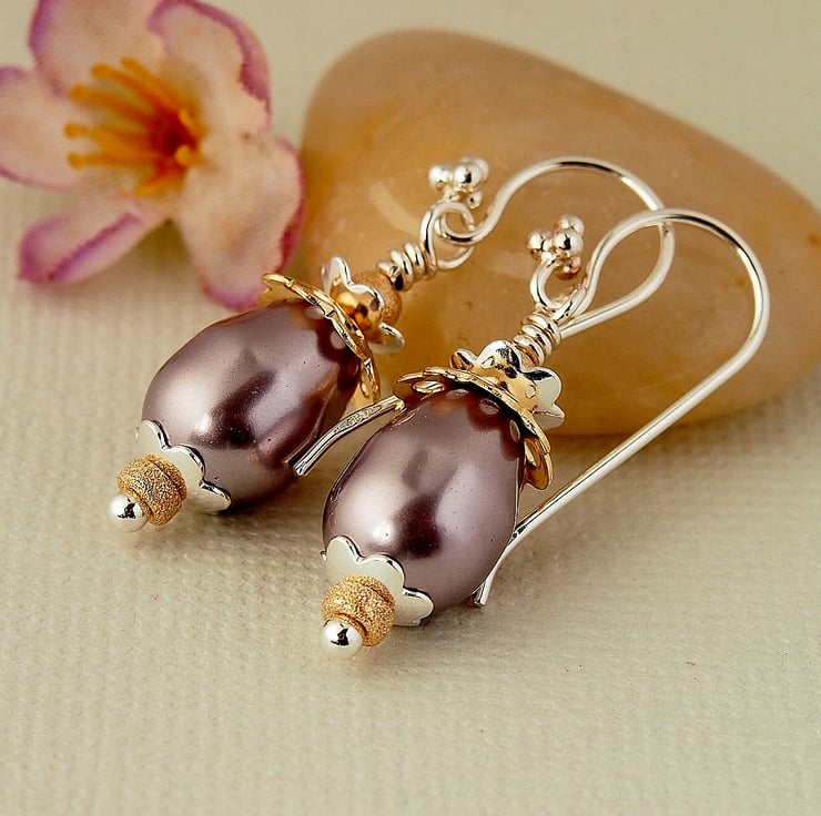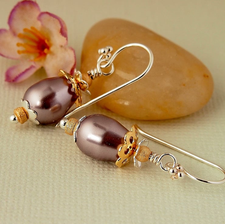 Handmade earrings featuring Swarovski drop pearls in Mauve emerging from sterling silver and gold filled flower beadcaps, and enhanced with gold filled accent beads.