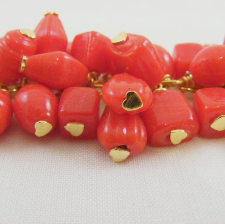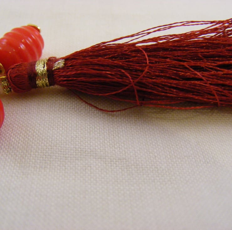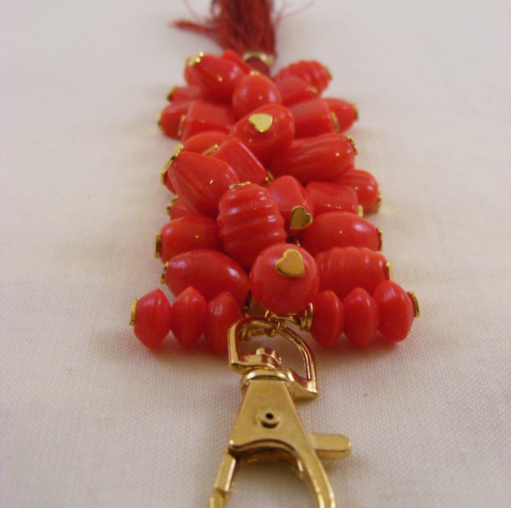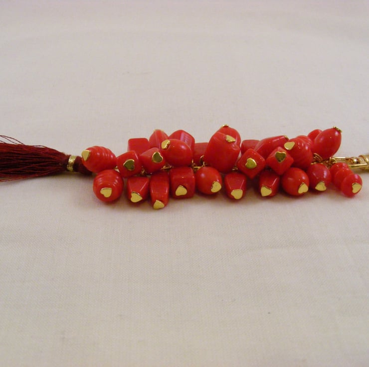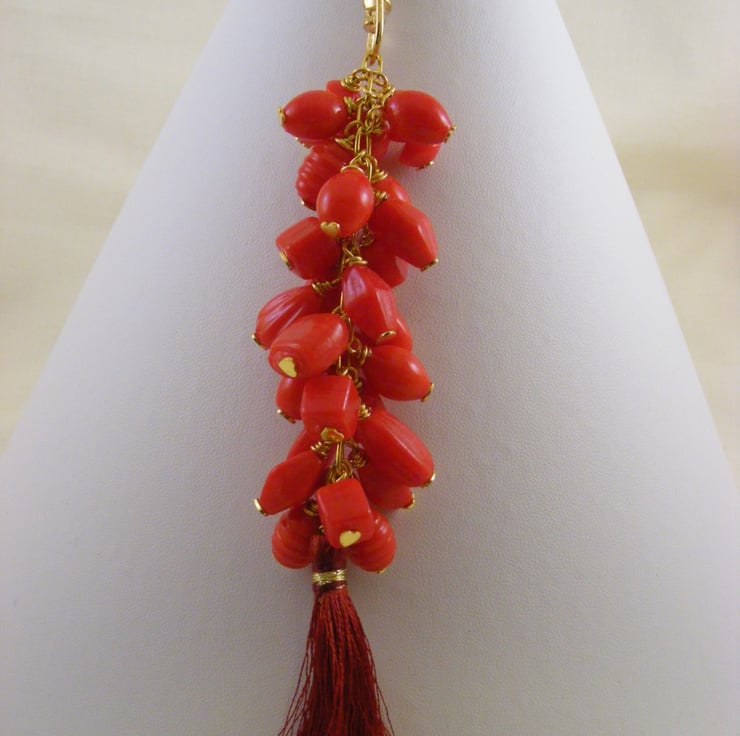 Bag charm is made with a red cotton tassel and assorted red glass beads ranging in size from 10 x 8 mm to 10 mm. Chain, headpins and clip are gold plated.