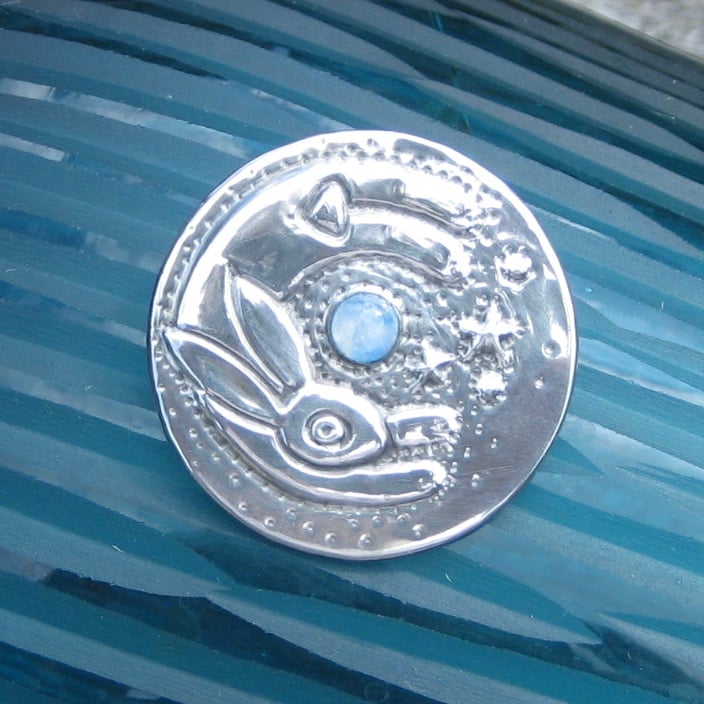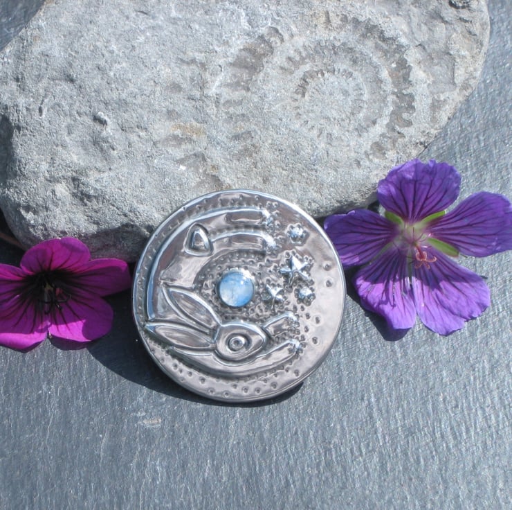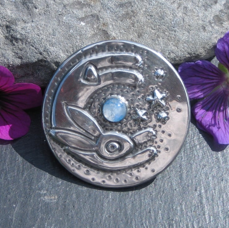 Hare brooch with rainbow moonstone handmade in silver pewter. I have made this brooch by hand to my own original design from modern lead-free pewter, and set it with a beautiful rainbow moonstone, which has been enhanced with a backing of blue foil.
