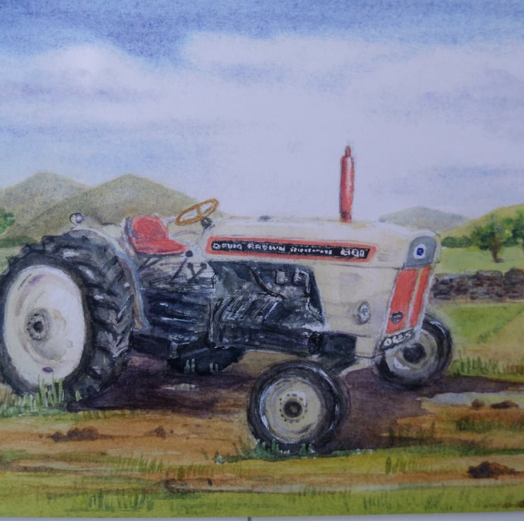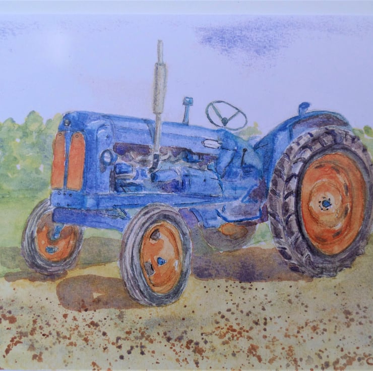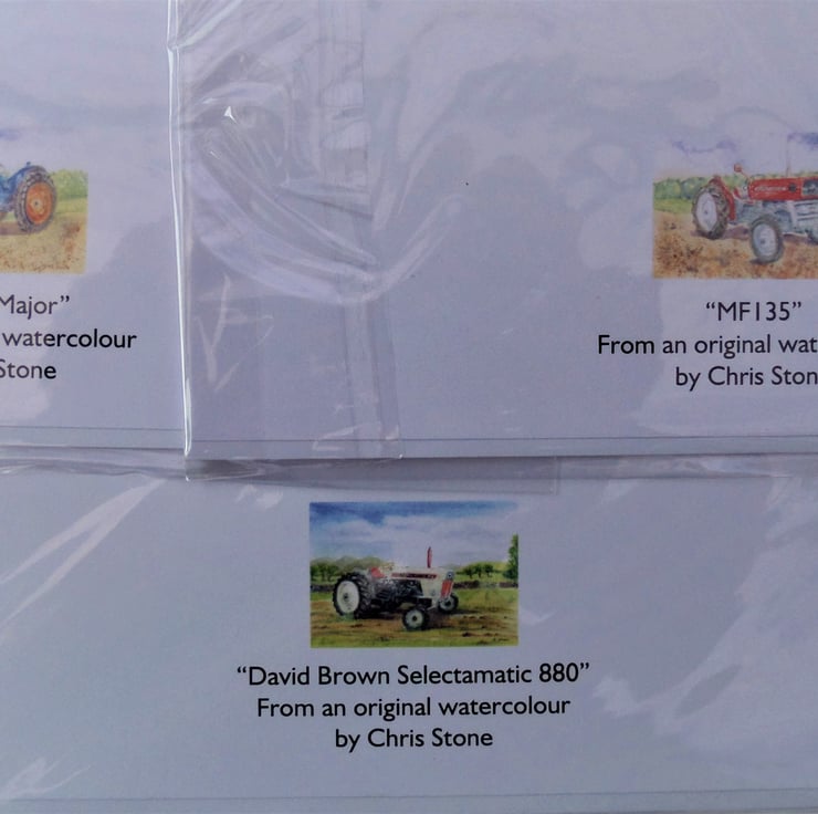 A pack of three greetings cards of different designs, professionally printed from my original watercolours: A red Massey Ferguson 135 tractor, a blue Fordson Major and a cream David Brown 880.