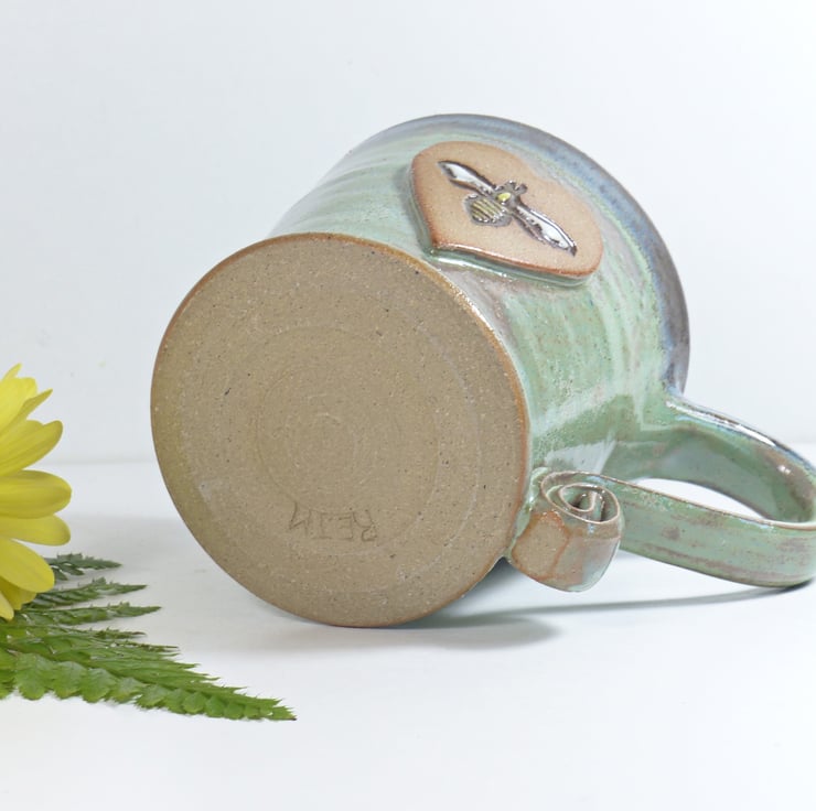 I threw the body on the wheel using a lovely stoneware buff clay. Stoneware clay makes for a very strong and durable mug. I then trimmed the base and pulled a handle before attaching the decoration. The stamp I used for the bee was a gift from my daughter after her travels to Nepal.