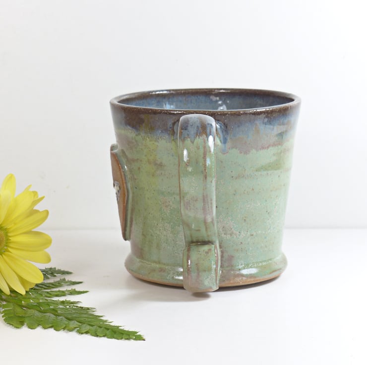 The mug was then fired to 1000C to what is called bisque ware. The base and design were waxed and I then glazed with a lovely sweet green. It was then re fired to 1240C. That's hot!