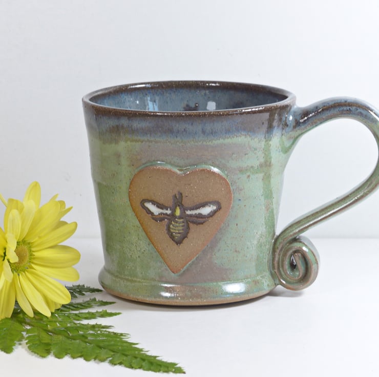 It's a clean lined mug with a wonderfully imprinted bee in a heart.