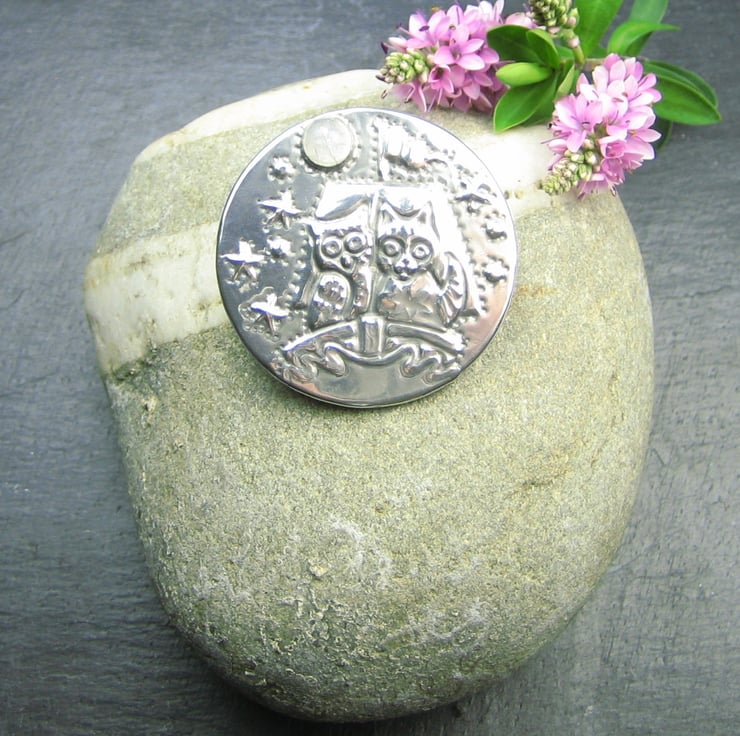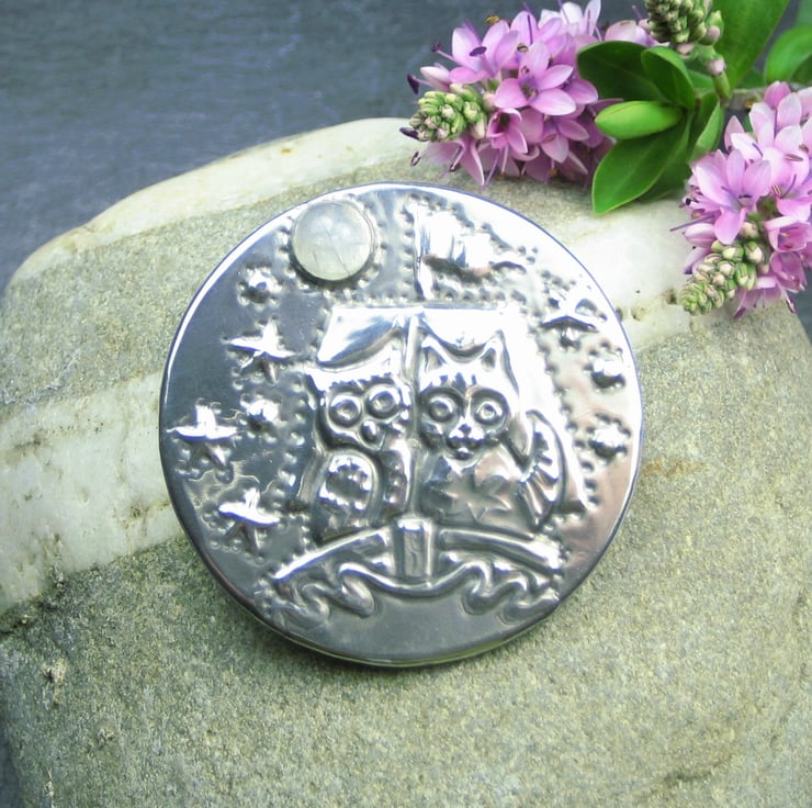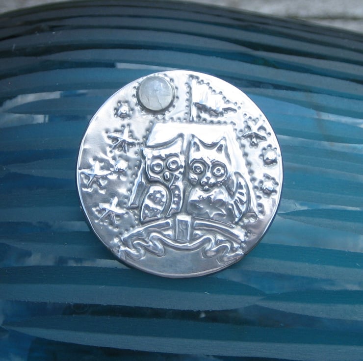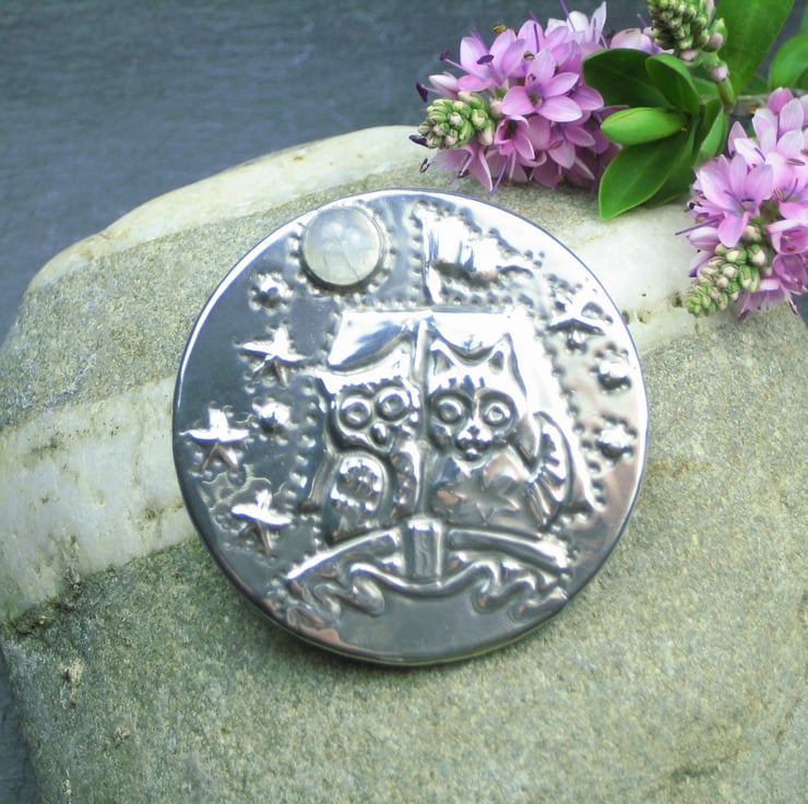 The Owl and the Pussycat jewellery in silver pewter, handmade. This hand crafted brooch depicts Edward Lear's romantic pair sailing beneath a moon of genuine rainbow moonstone. Rainbow moonstone varies and this particular example does not show much colour, but still makes a lovely moon to light the little characters on their voyage.