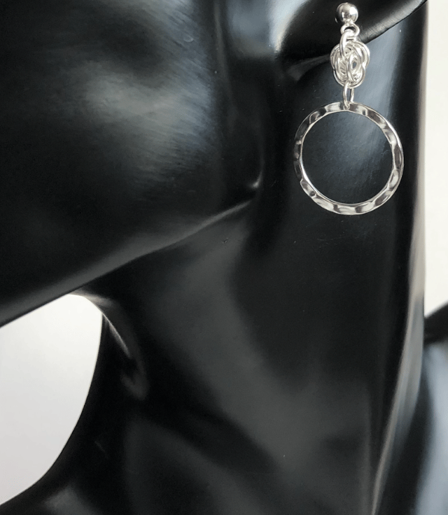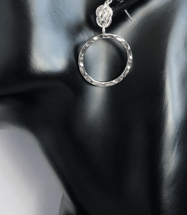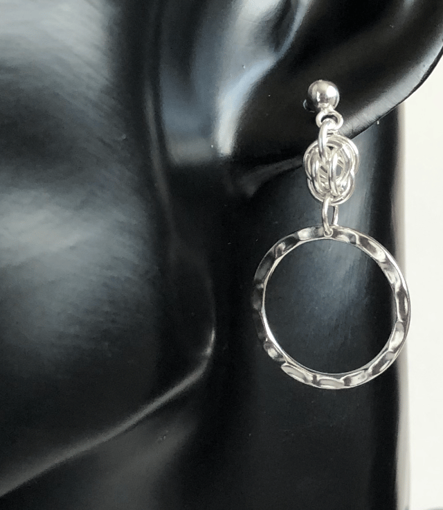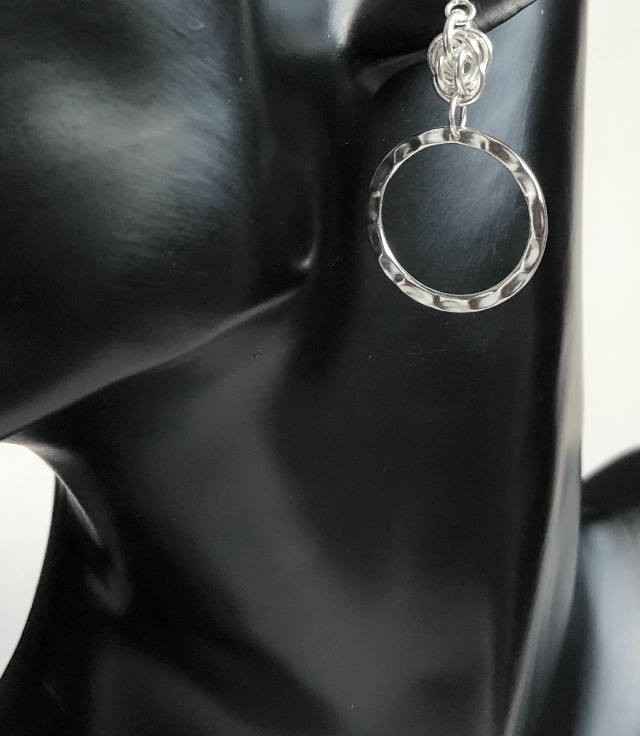 The earrings have a hammered effect detailed on each ring with a chainmaille section called a sweet pea at the top of the ring.