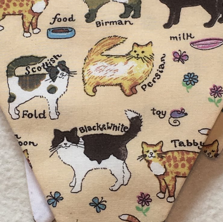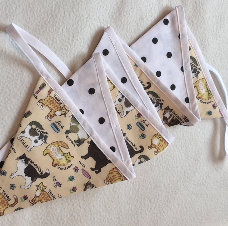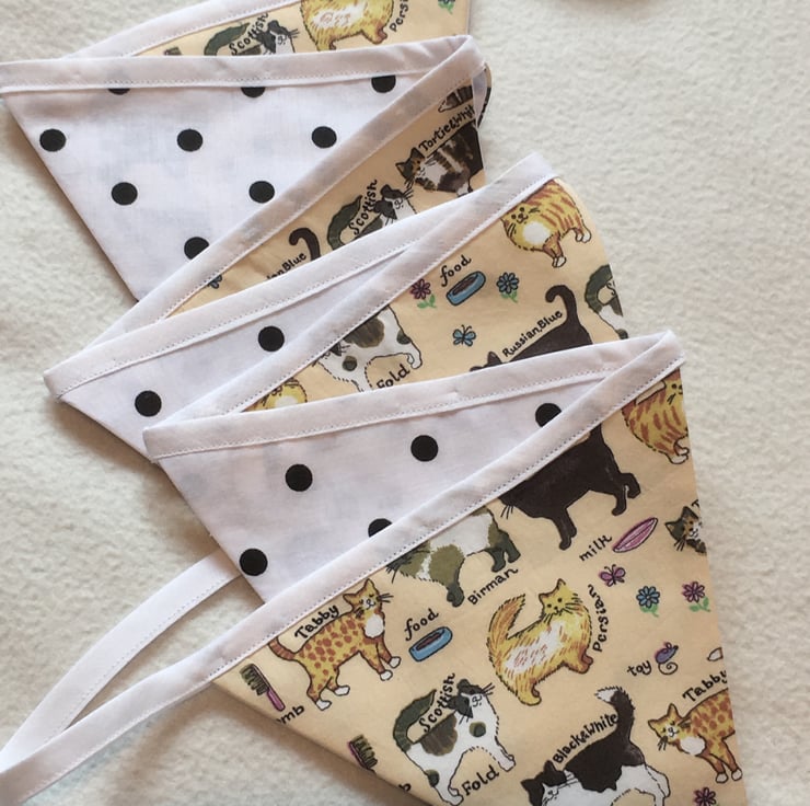 Each flag is made with Cat printed fabric, the background is a pale creamy-yellow and is backed in white poplin with Black spots.