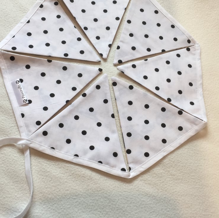 The flags hang from white bias binding and is roughly 2m long with aprox 35cm each end to tie the bunting.