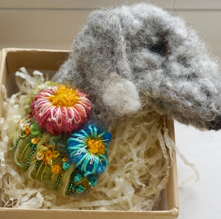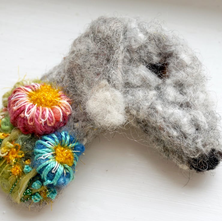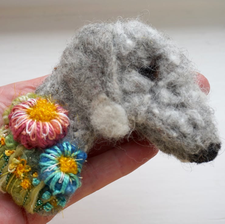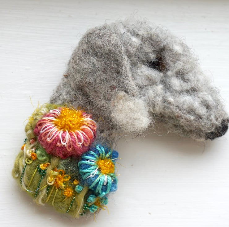 Needle Felted and embroidered bedlington terrier brooch with metal brooch bar on back.Measures approx 4 inches