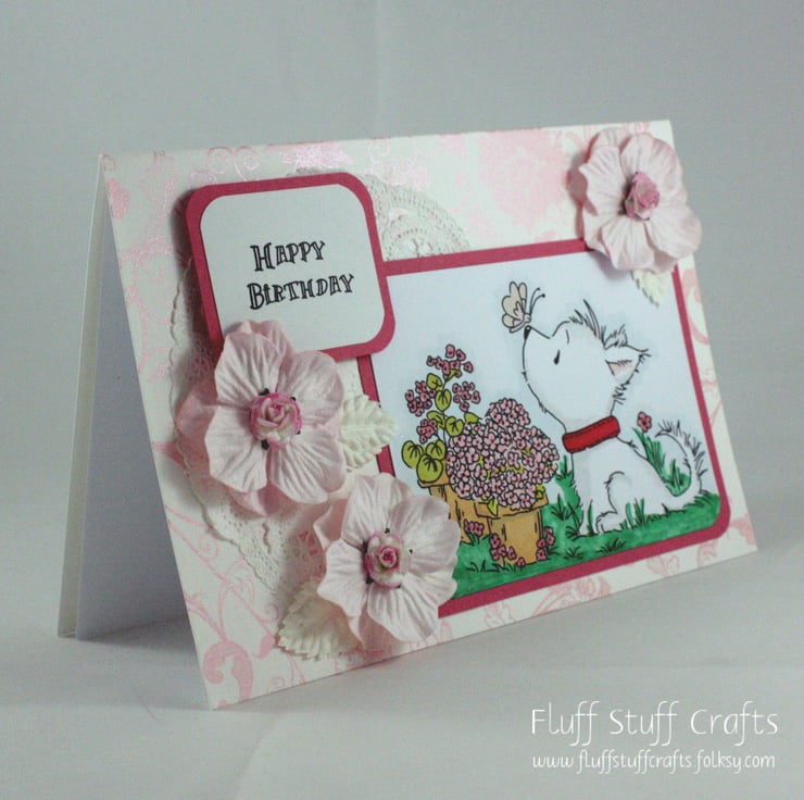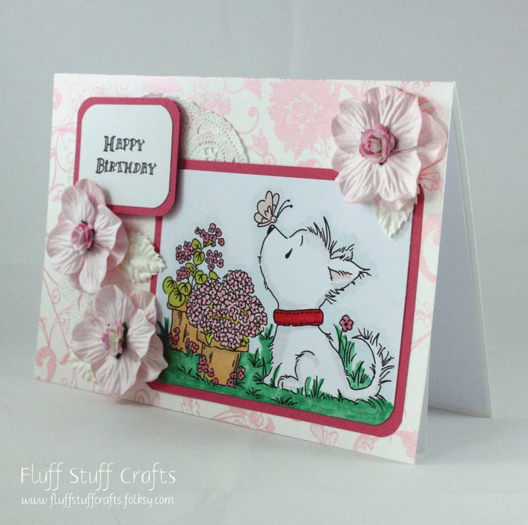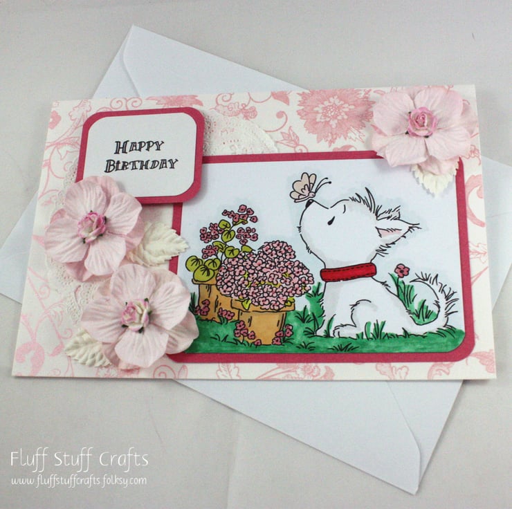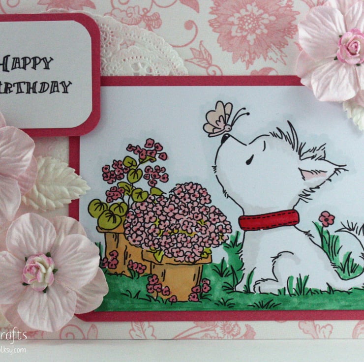 Birthday card featuring a hand coloured image of a West Highland terrier taking time to smell the flowers and the butterflies. The image and sentiment 'Happy Birthday' have been framed with pink card on a patterned, pearlescent card blank. The card is embellished with pale pink paper flowers.