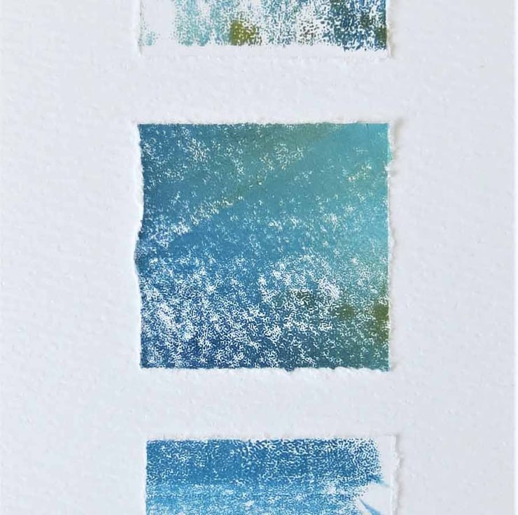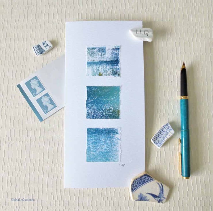 Abstract mixed media art card in tones of teal, aqua an sea green inspired by the coastal light.