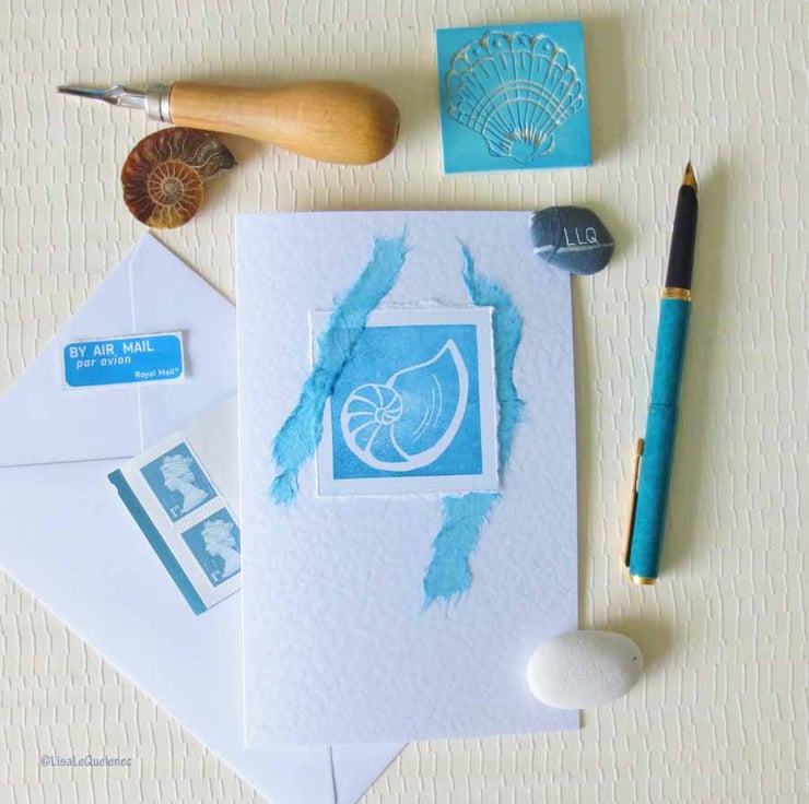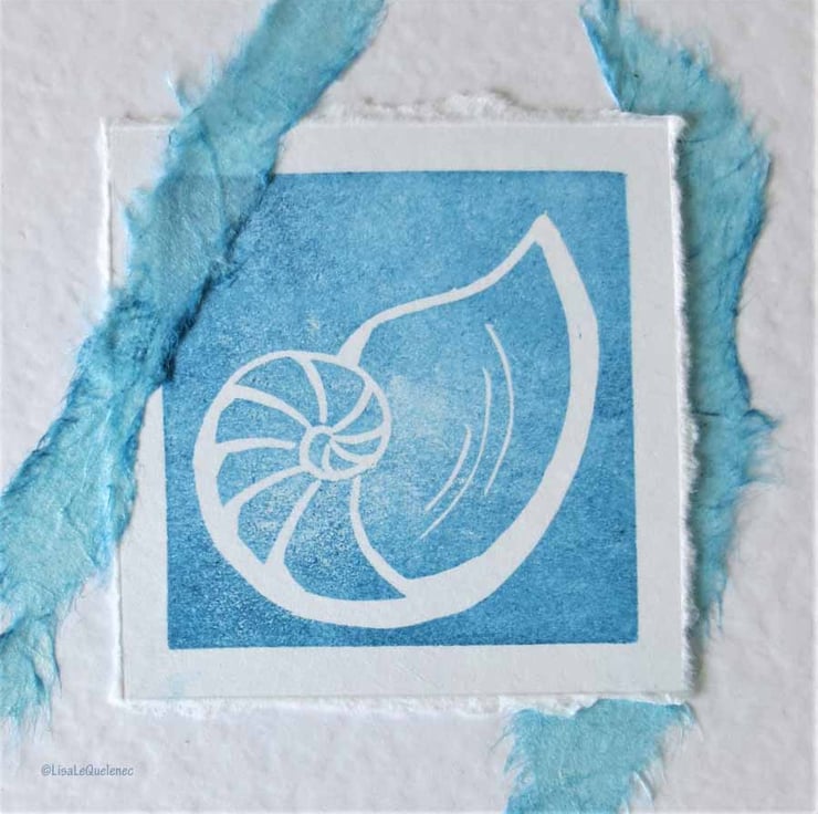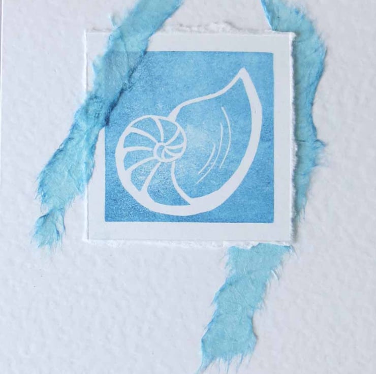 Handmade handprinted art card of a spiral sea shell. Perfect for shell collectors, beachcombers and mermaids everywhere.