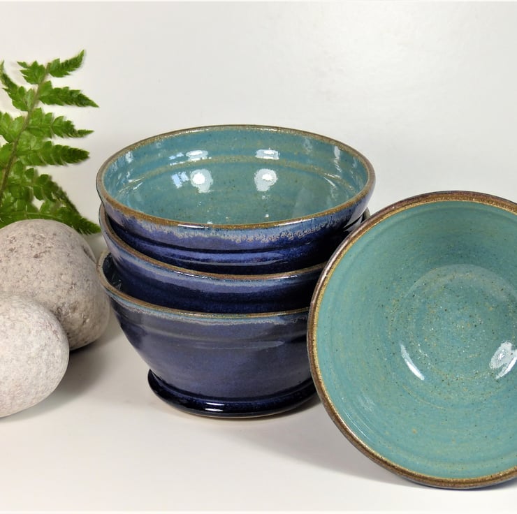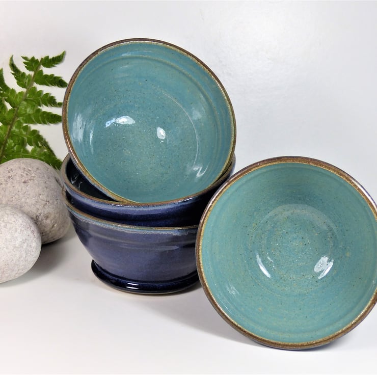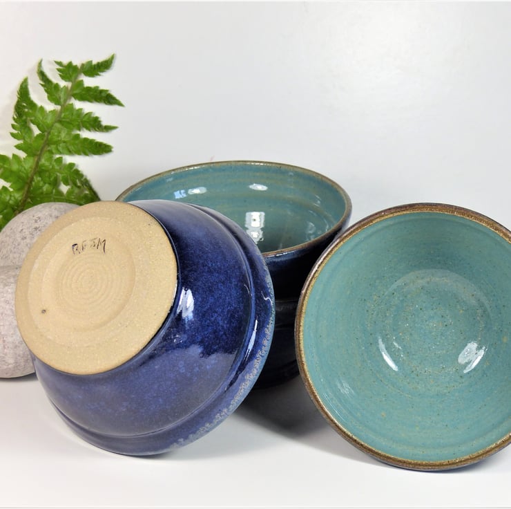 The colours in this bowl include on the inside a rich ovely mediteranian blue, the rim an olive green, and the outside a rich blue.