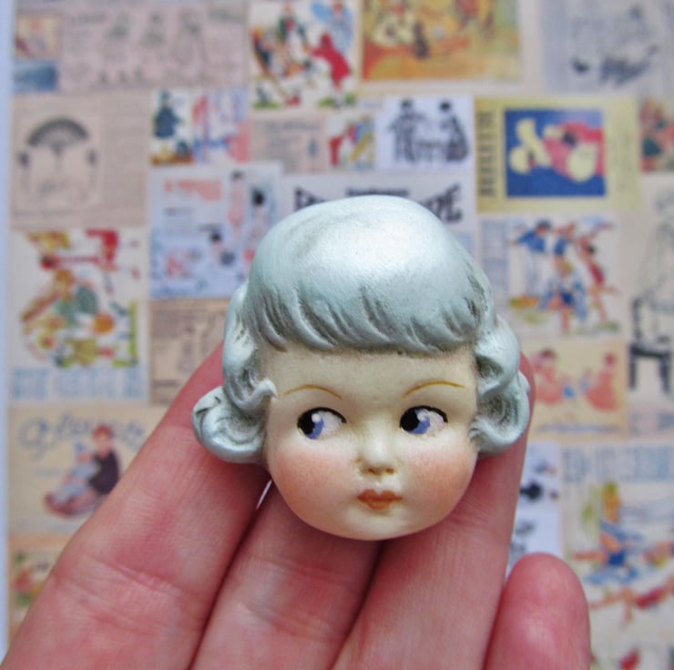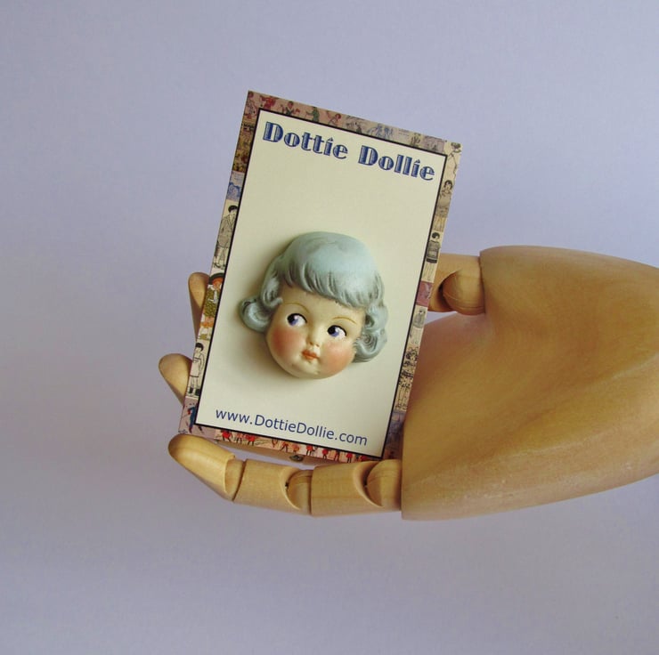 Vintage Doll Pin Brooch - Mint Haired Rose is a handmade replica of a real broken antique doll head from my collection, the original head was broken, dirty and unloved, having been discarded and buried as rubbish almost a hundred years ago.