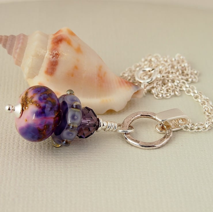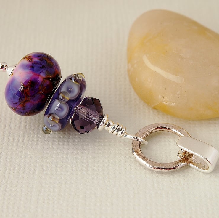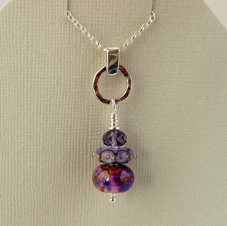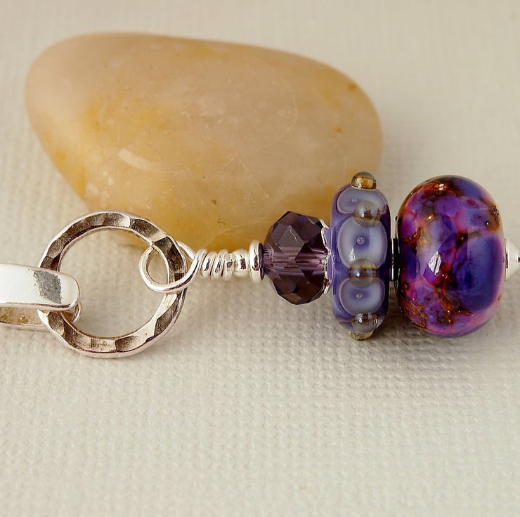 Beautiful pendant featuring 2 coordinating lampwork beads handmade by UK glass artists topped with a Czech faceted glass crystal. The beads are threaded on a sterling silver headpin and connected to the sterling silver bail by a sterling silver hammed ring.