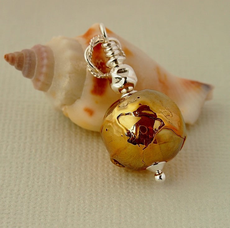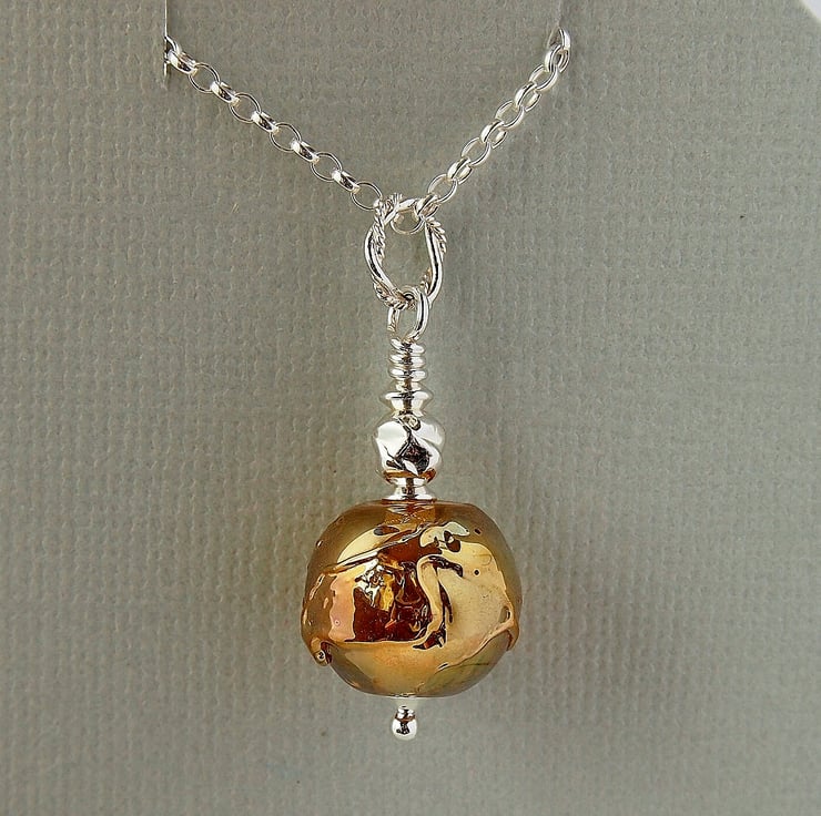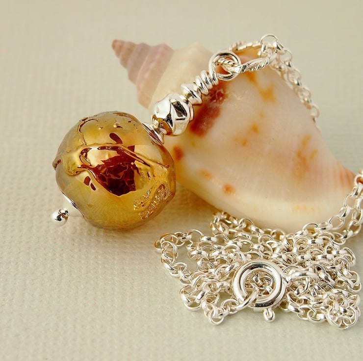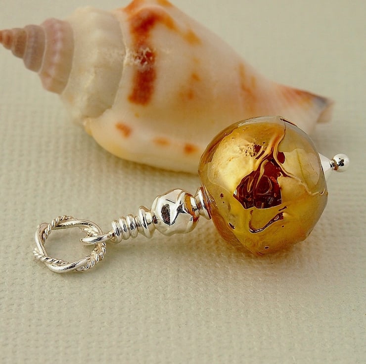 Beautiful gold glass pendant featuring a stunning lampwork glass bead handmade by a UK glass artist.This lovely bead has been made using pale amber glass with shards of silvered reflective glass melted on to the surface.