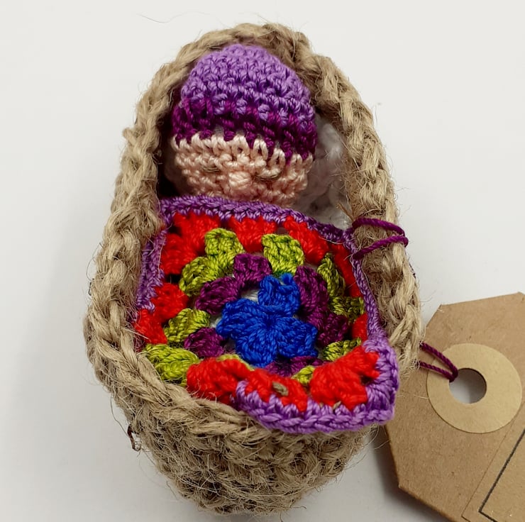 The basket is crocheted in jute and the baby and bedding in cotton. The baby is filled with polyester stuffing. There is a tag attached which reads 'Congratulations on the birth of your beautiful baby boy's although I am very happy to exchange this tag for one with a message of your choice.