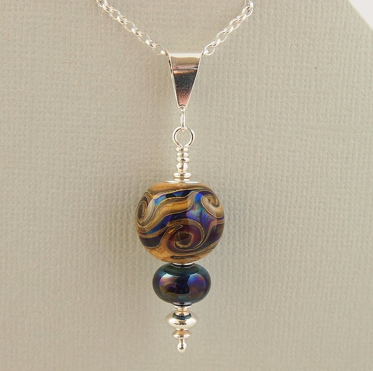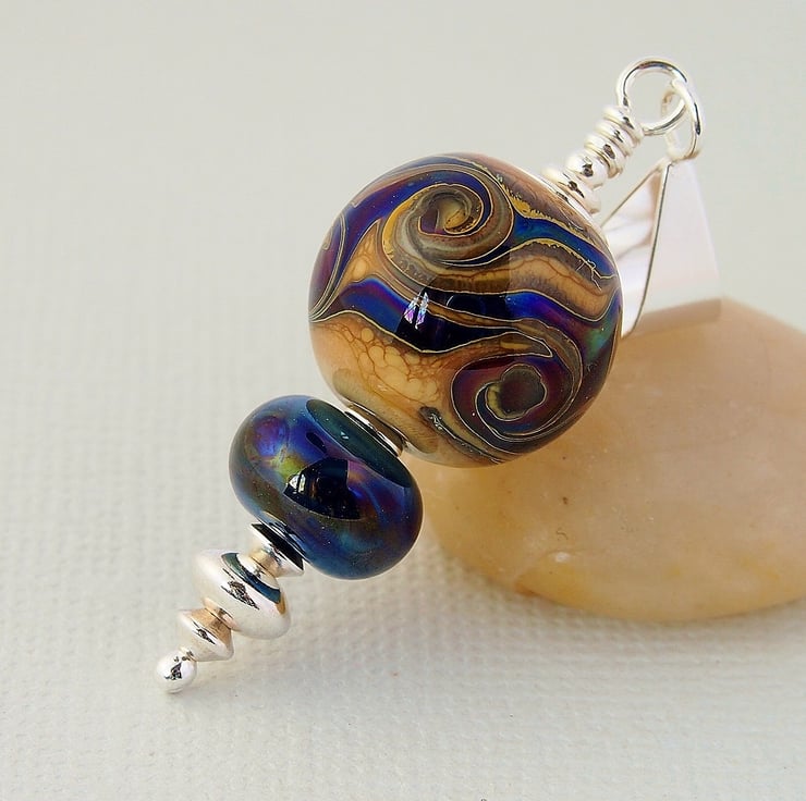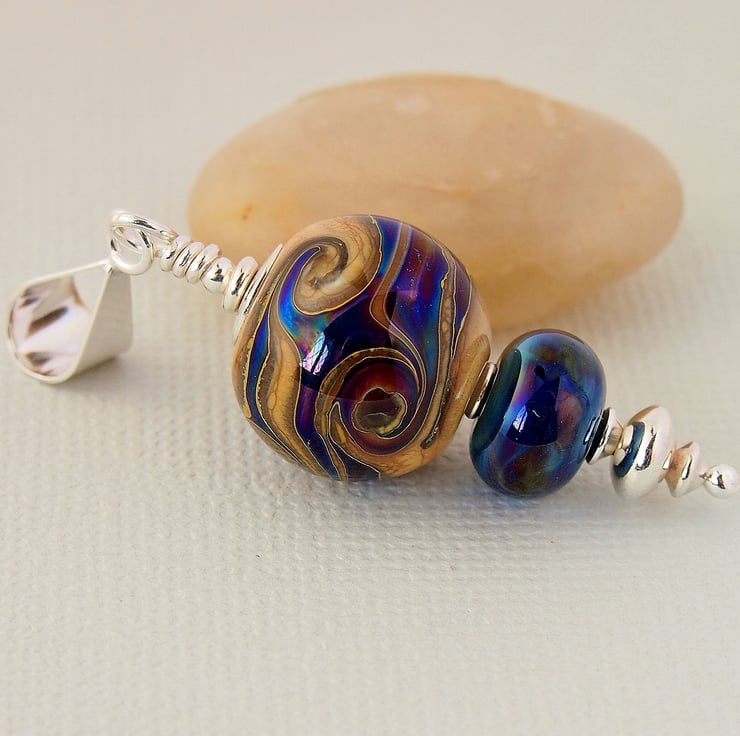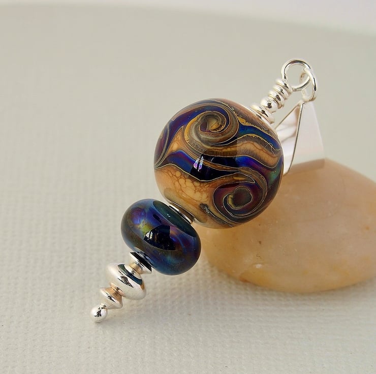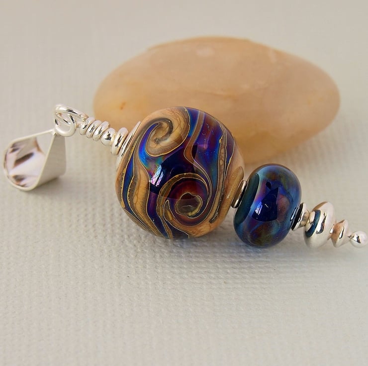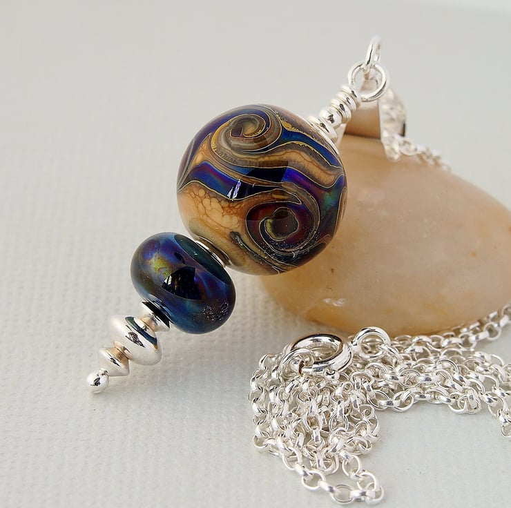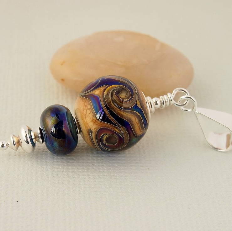 The main bead has been made with an organic looking beige glass and has been embellished with swirls of blue silvered reflective glass. I have complimented it with a smaller bead in the same blue glass. The pendant has been completed using a sterling silver headpin and beads, and hangs from sterling silver bail.