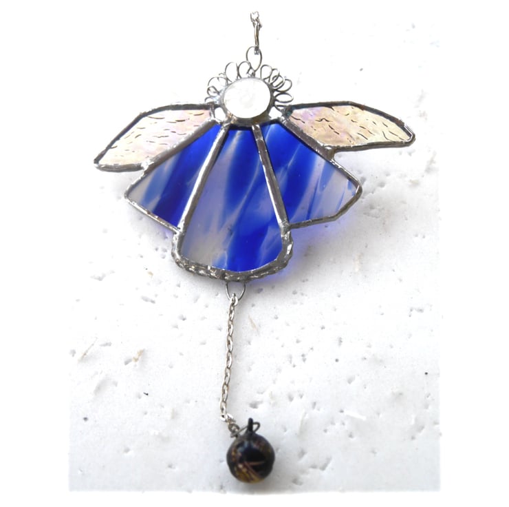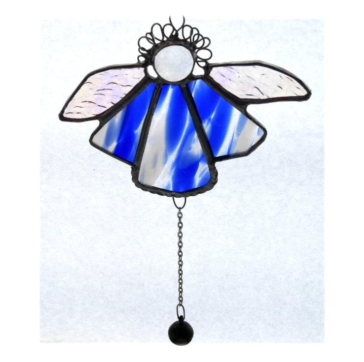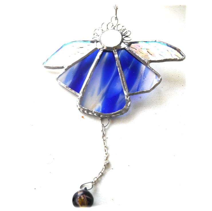 This is a stained glass suncatcher, an angel, handmade using the Tiffany copper foil technique.