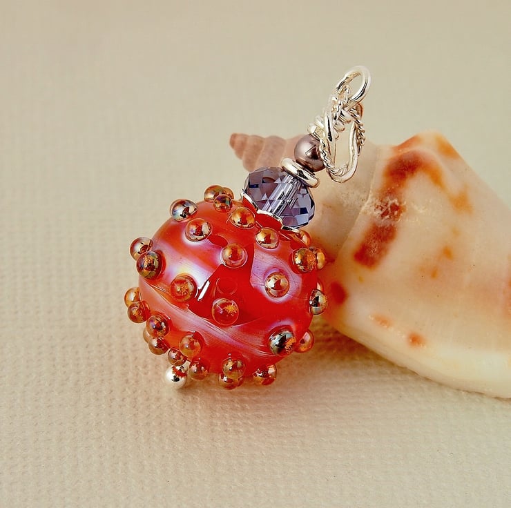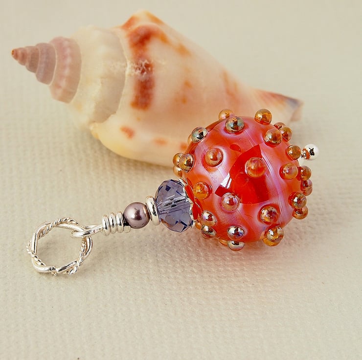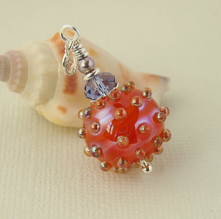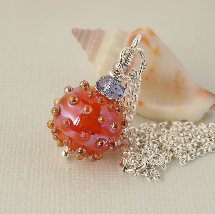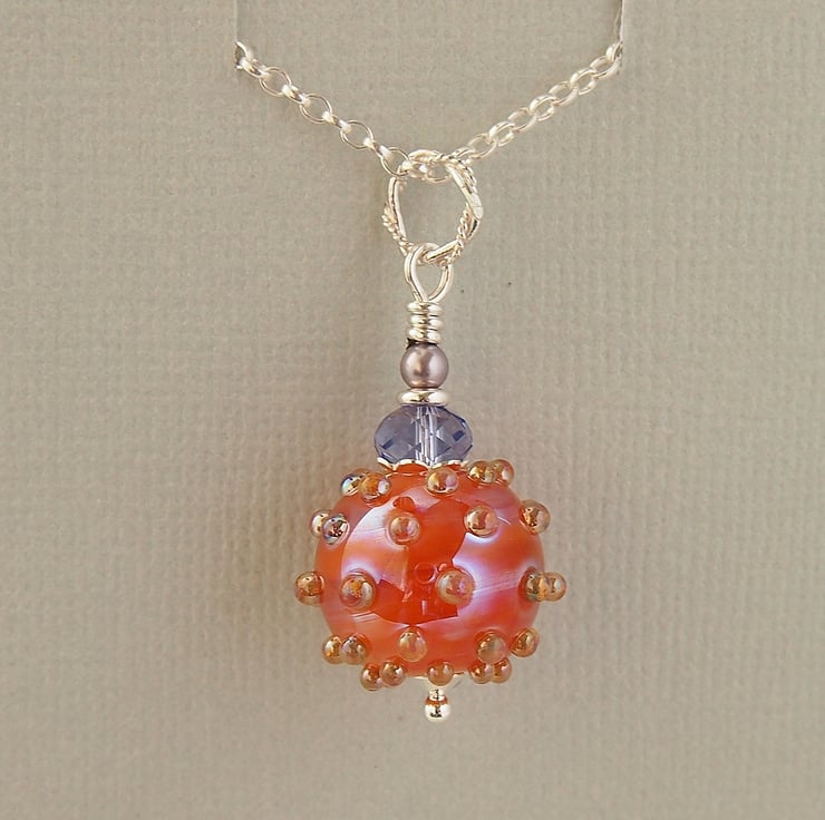 Handmade orange pink glass pendant featuring an artisan lampwork glass bead made with orange pink silvered glass and surface dots of reflective glass giving hints of pink and purple.