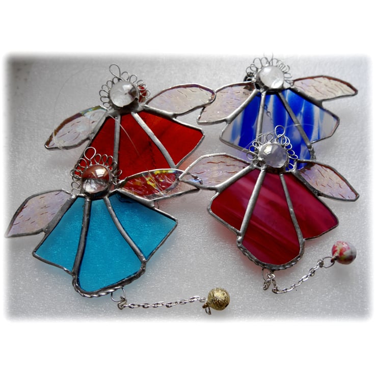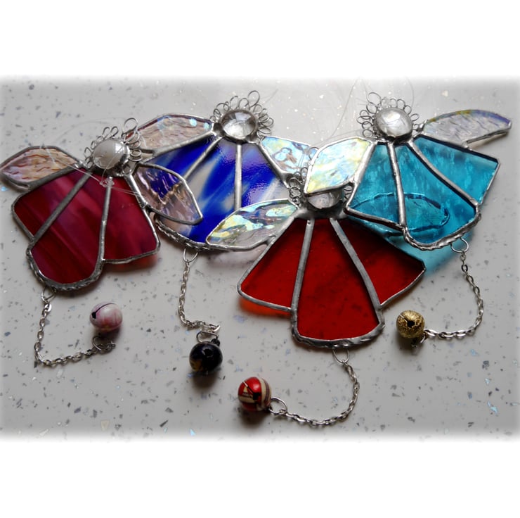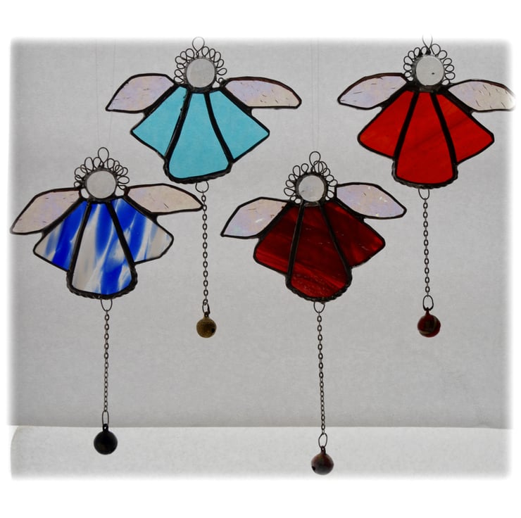 This is a stained glass suncatcher, an angel, made using the Tiffany copper foil technique.