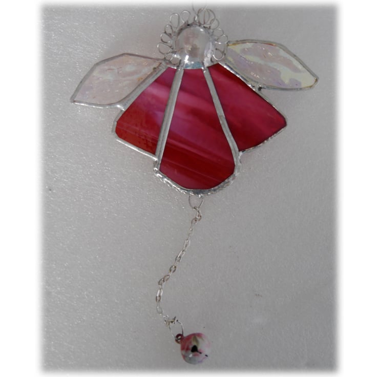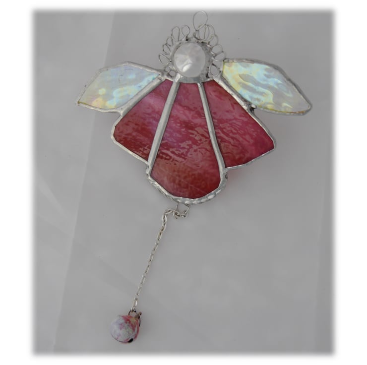 This shiny angel is very pretty. Her dress is cranberry glass, fusing glass as its the only type of glass where I can get this richness of pink; her wings textured clear iridescent and she has wire curls all over her glass nugget head.