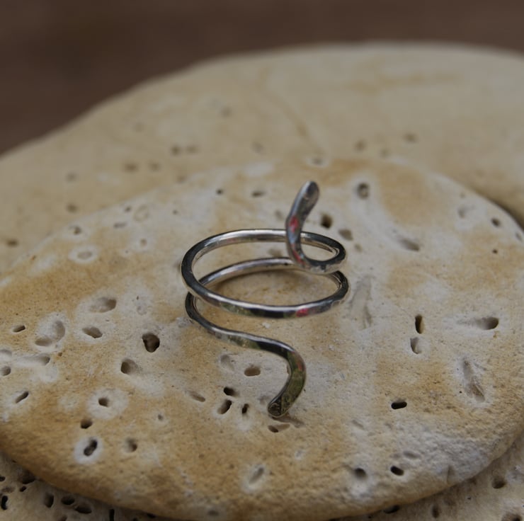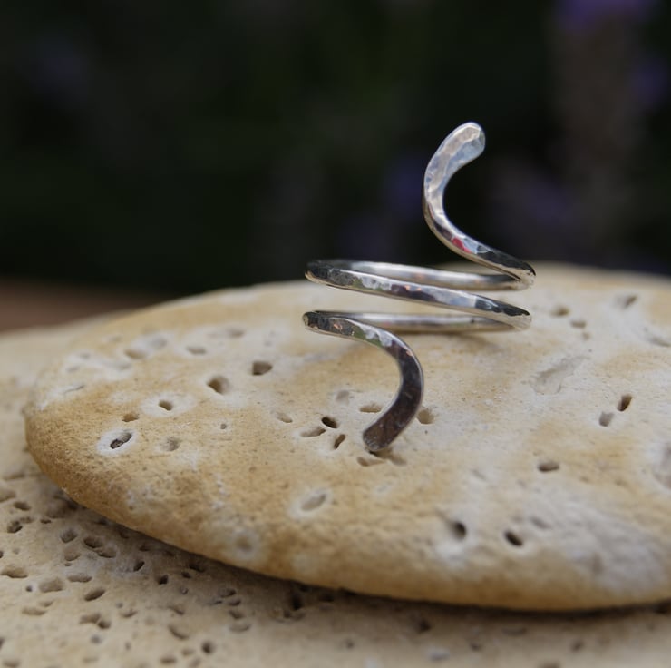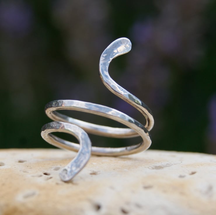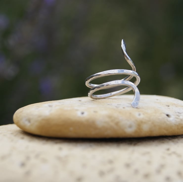 Each end is formed to represent two snake heads; curving taking an abstract snake like form. The silver surface has a dappled effect created with my hammer during the making process, light reflects on the silver giving the ring a real pop.
