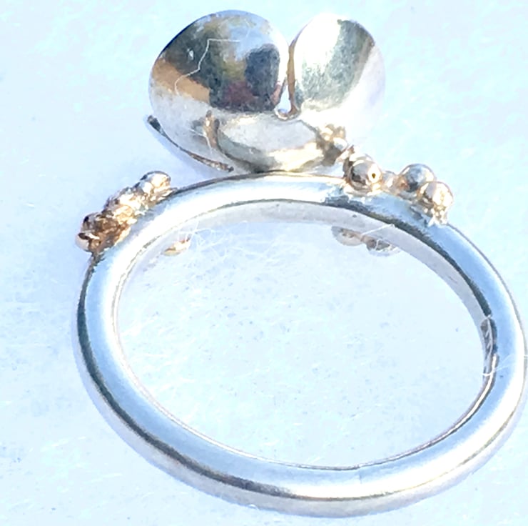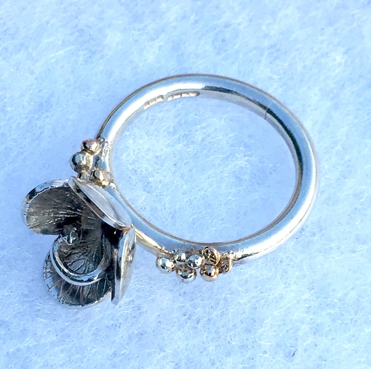 Made from high-quality sterling silver and adorned with 9-carat yellow and rose gold granulations, this ring is hallmarked for authenticity.