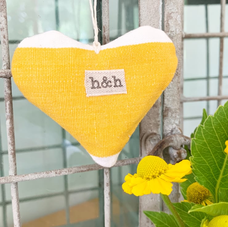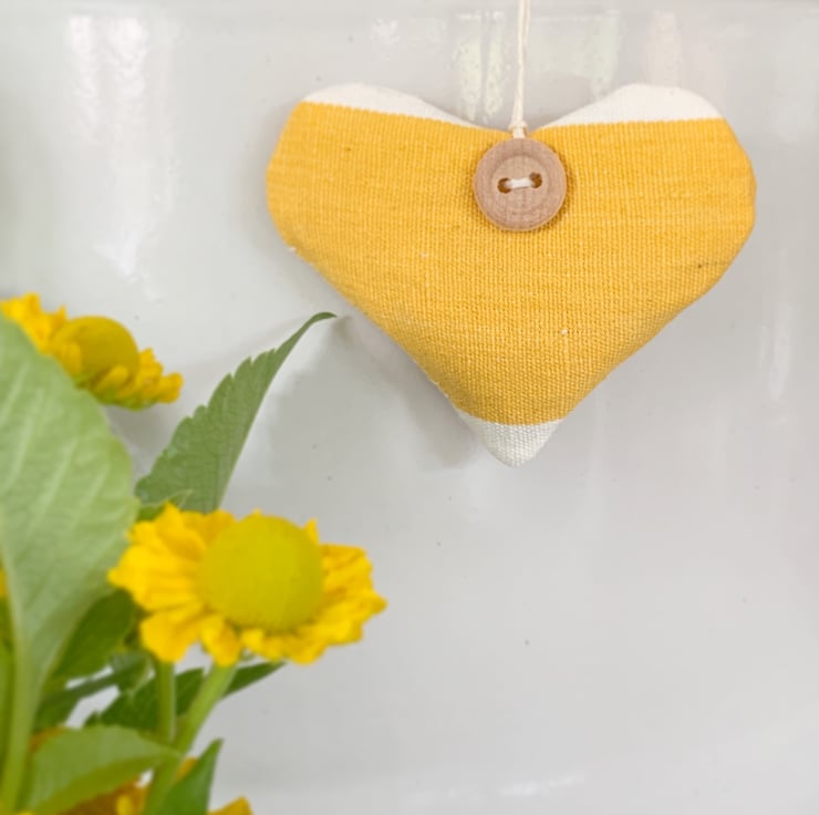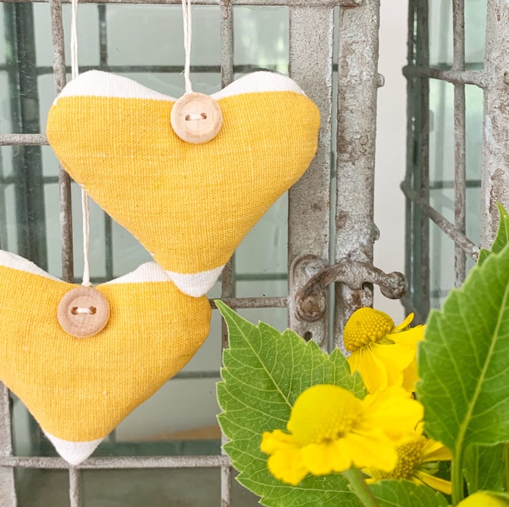 Handmade in my summerhouse studio in Hampshire, these little lavender hearts evoke sunshine and happy times. In yellow and white broad striped cotton and plump with locally grown Hampshire lavender, the hearts are finished with a rustic wooden button and a natural