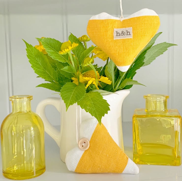 Sunshine, sunflowers, butter, buttercups, positivity, energy, joy....everything that yellow brings to mind. I first made these jolly yellow and white hearts with a tiny fabric swatch that I had been safe-keeping for a special product. The first hearts were so popular that I just had to go on and make more - I hope this new shape makes you as happy as it makes me.