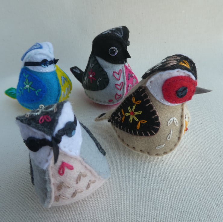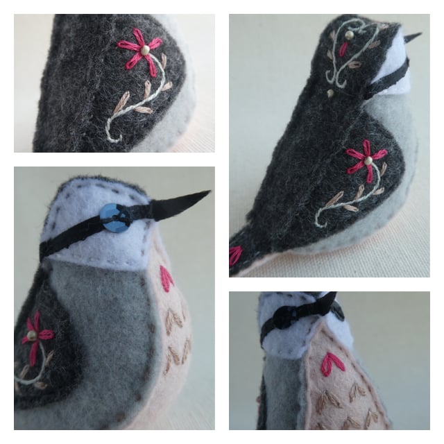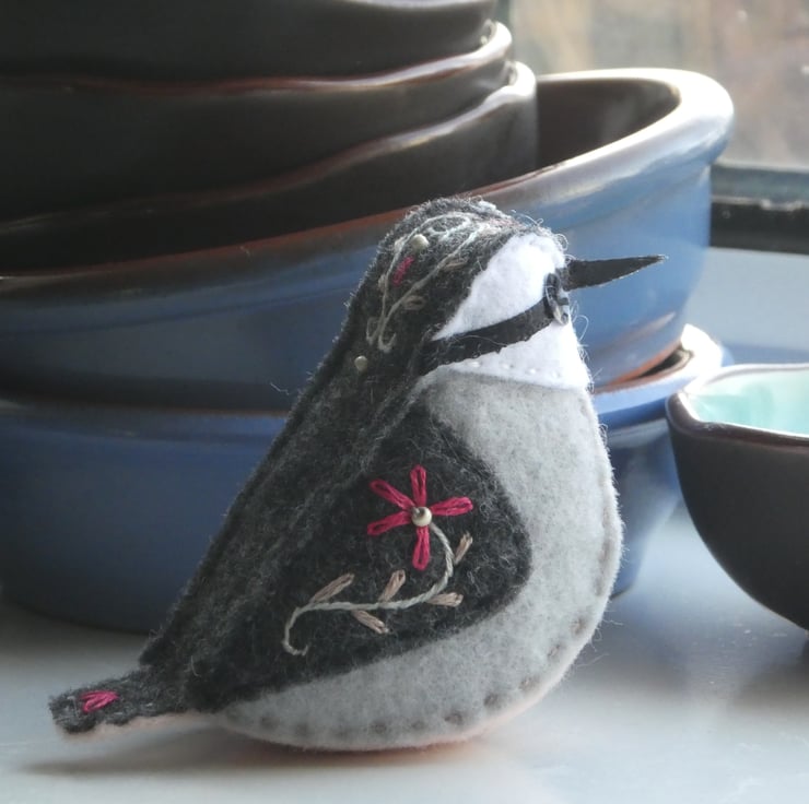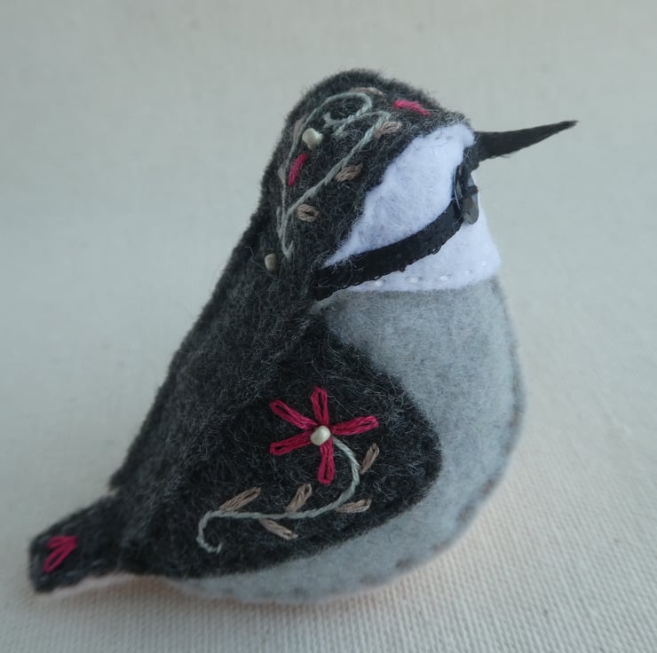 This little nuthatch is made from felt which I've embellished by hand with embroidery and beads. The eyes are sequins and the bill is ribbon stiffened with nail varnish. The felt is made from 100% polyester from post consumer plastic bottles. It stands just over 6cms tall and is about 7cms to the end of the tail, plus the bill of about 12mm, it's filled with off-cuts of material and weighted with some 1p coins for stability.