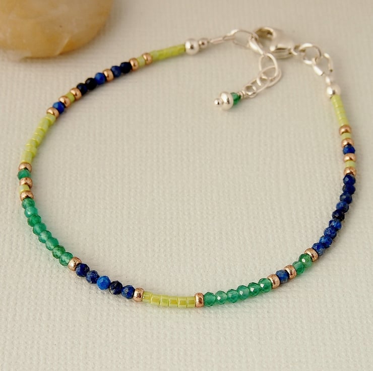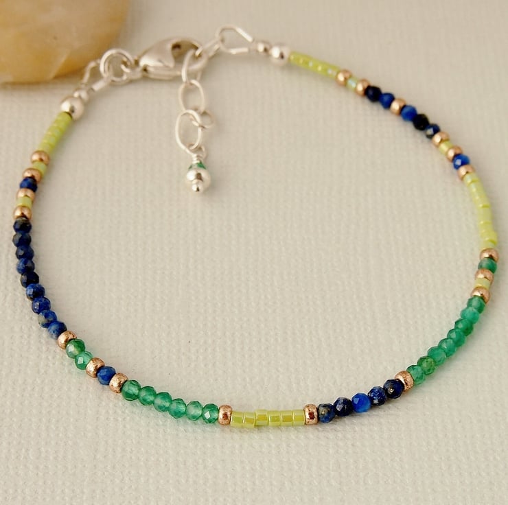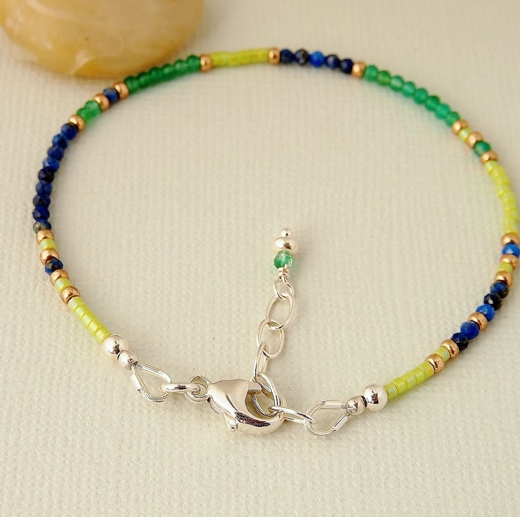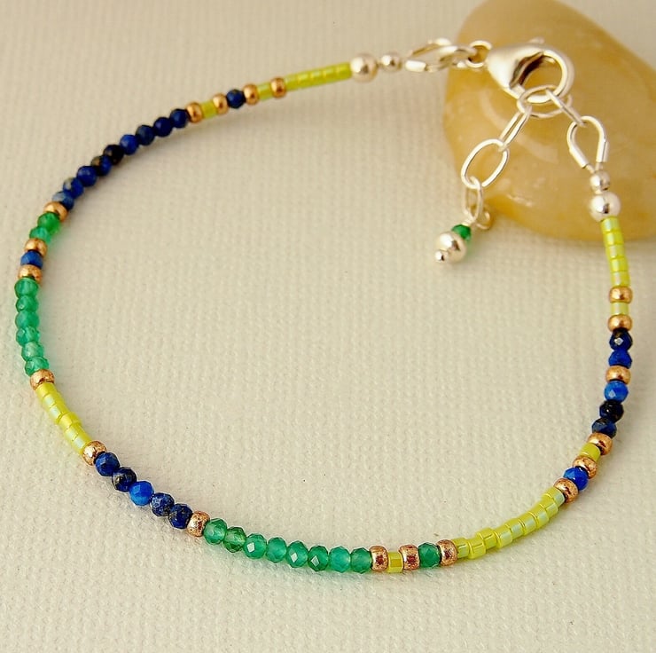 Delicate gemstone bracelet featuring tiny faceted beads of Green Onyx and Blue Lapis Lazuli, with bright green lustre seed beads and accents of gold. The tiny gemstones are so pretty and really sparkle.