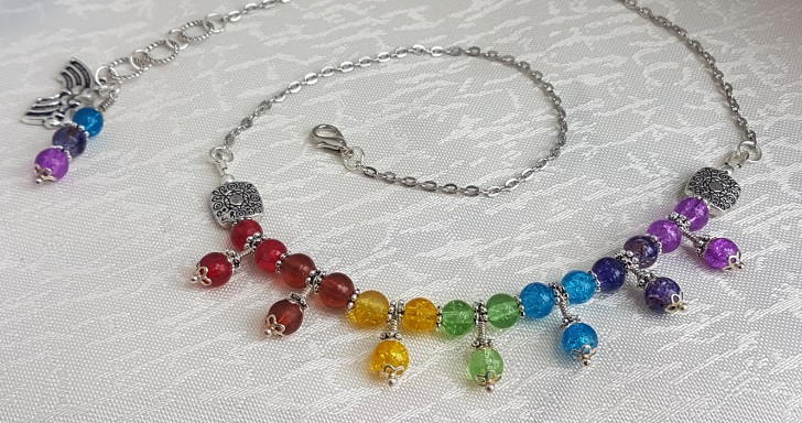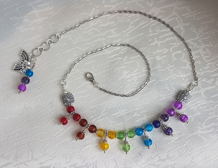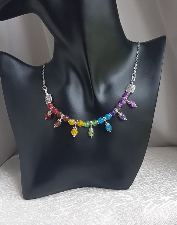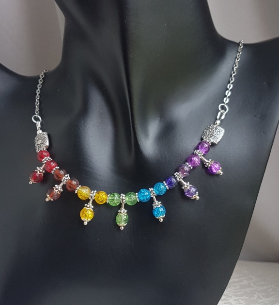 Gorgeous Rainbow colours necklace. Three beads of each colour suspended on a Silver tone chain. A unique handmade piece of jewellery. Great as an unusual gift or as a treat for yourself.