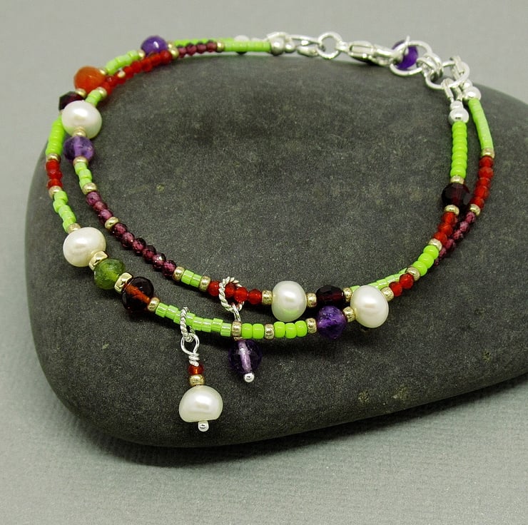 Double strand mixed gemstone bracelet featuring very tiny faceted Carnelian and Garnet gemstones. These delicate gemstones measure only about 2mm but they really do sparkle. I have added some larger gemstones, freshwater pearls and dark red Swarovski crystals before completing with lime green and champagne gold Miyuki seed beads. I have also added a free running charm dangle to each strand, one Amethyst and one freshwater pearl.