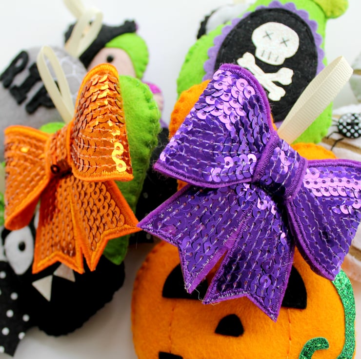 Set includes two sequin bow hearts and one each of: mummy, witch, skeleton, pumpkin, gravestone, poison bottle.