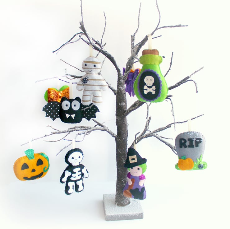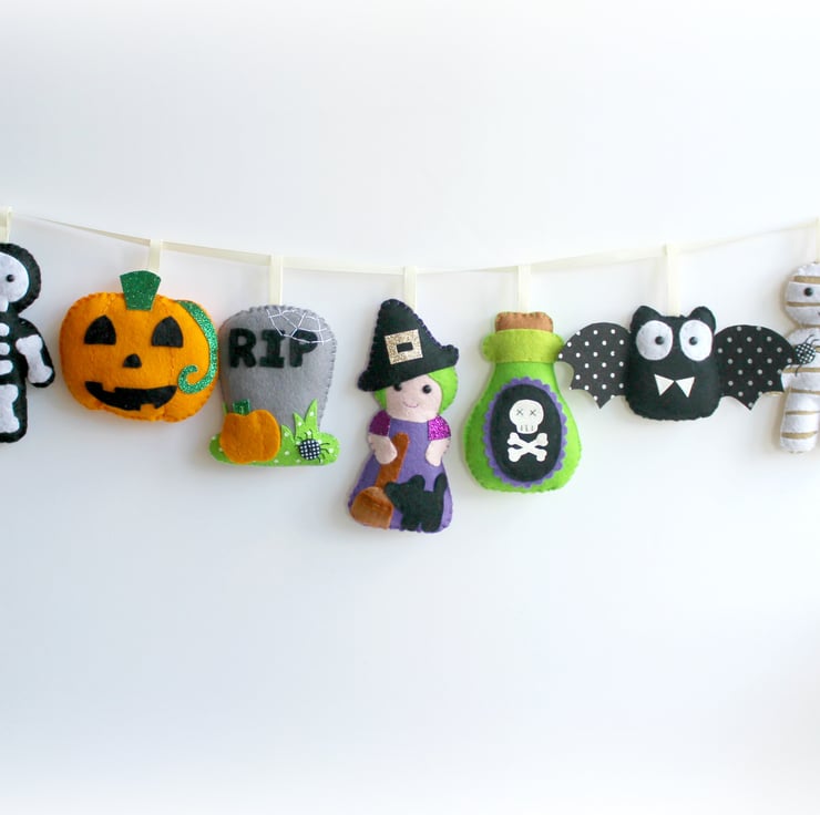 This listing is for a set of 9 wool blend felt Halloween themed decorations with ribbon loops to be used individually or strung along the supplied length of ribbon as a garland.