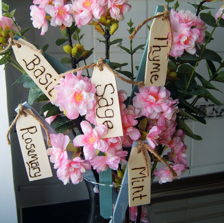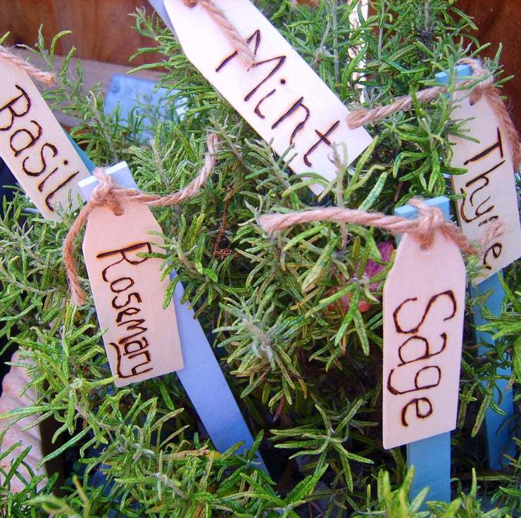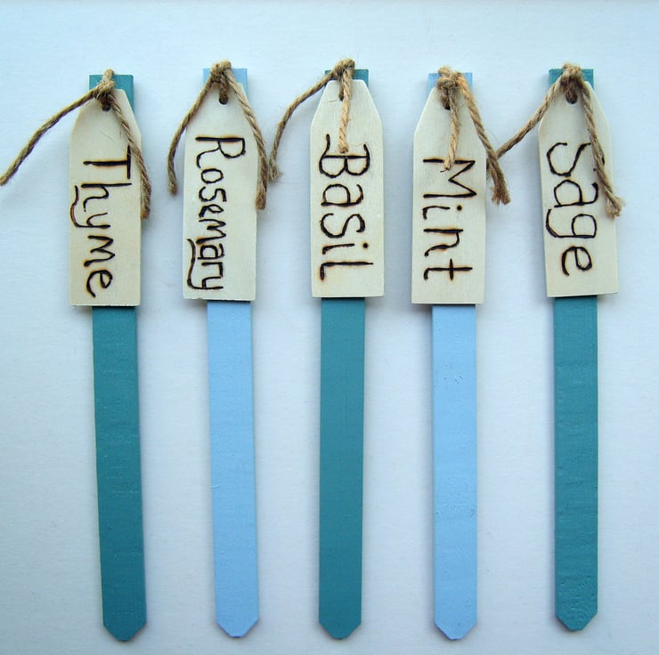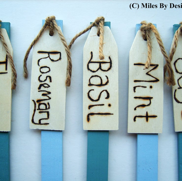 The names of the herbs have been hand pyrographied onto wooden tags that are affixed to the stakes with strong garden twine.