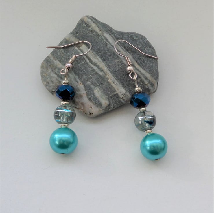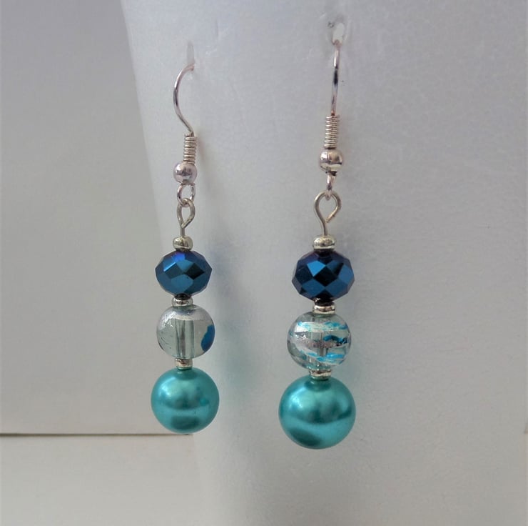 This pair of earrings is made using 10mm turquoise blue glass pearls, a clear bead with turquoise and silver splashes and a dark blue rondelle bead and tiny metallised silver glass seed beads.