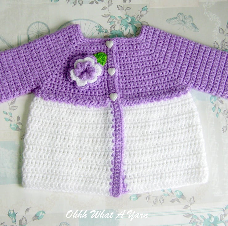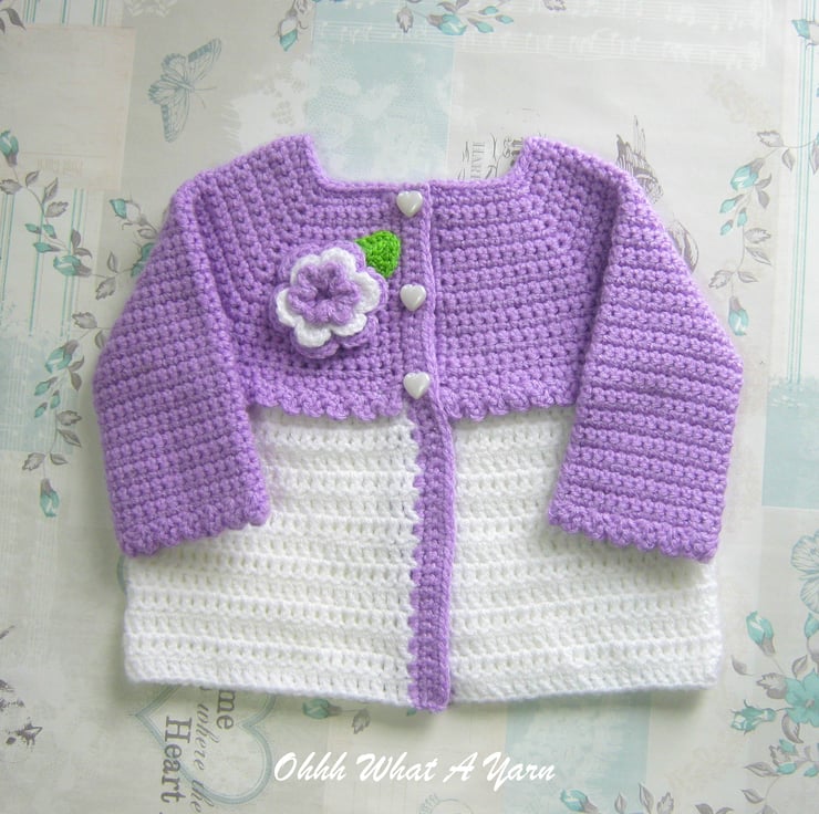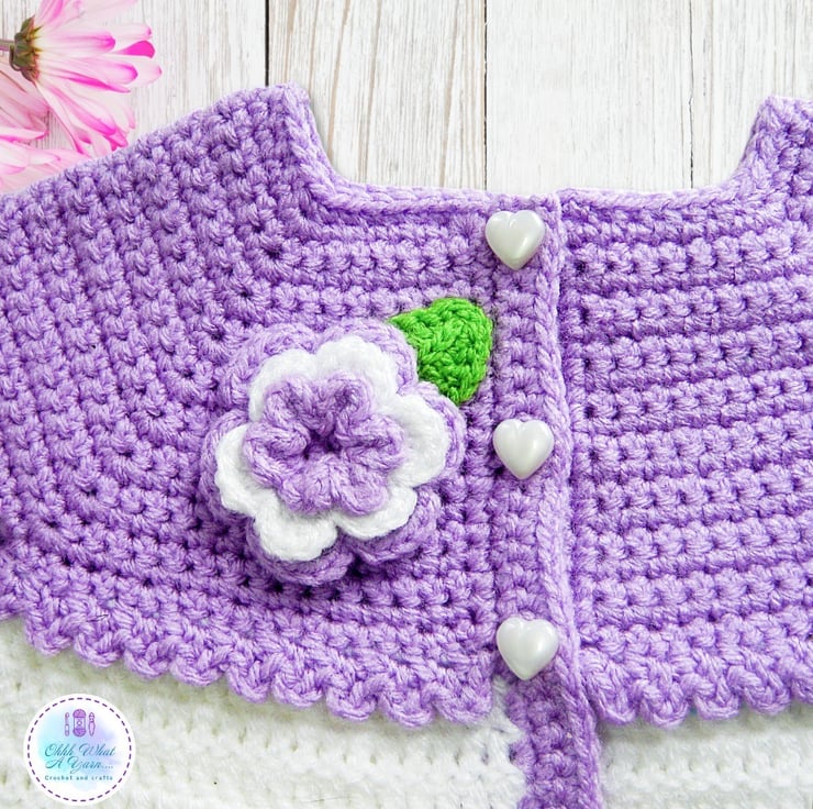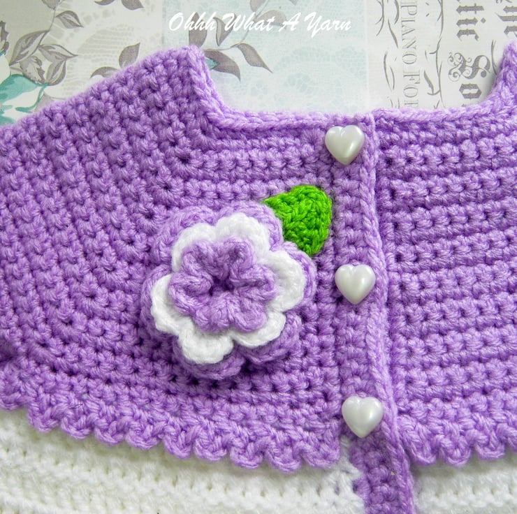 The cardigan/jacket has a lilac yoke with a frilly edge and the yoke is decorated with a three layered crochet flower blossom and a crochet veined leaf. It fastens with three cute pearlised heart buttons.