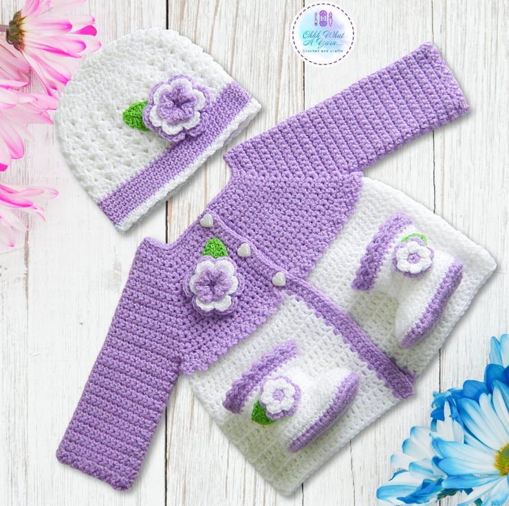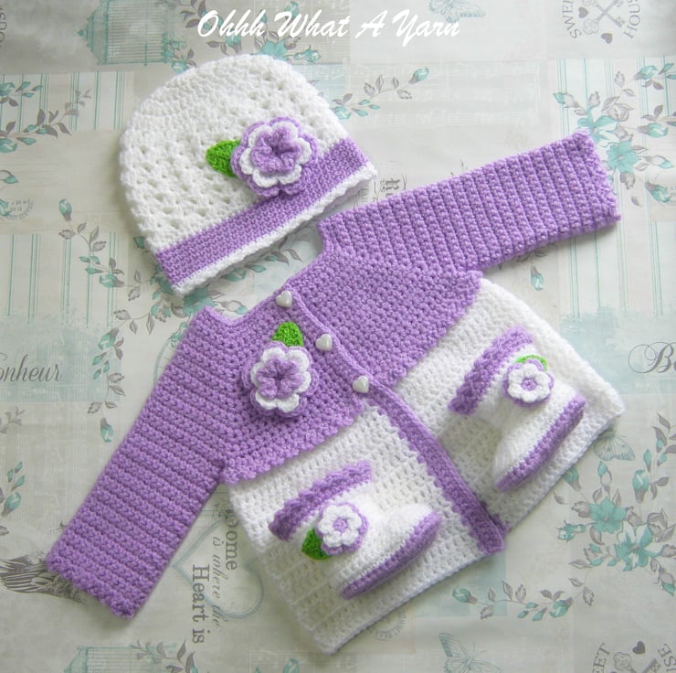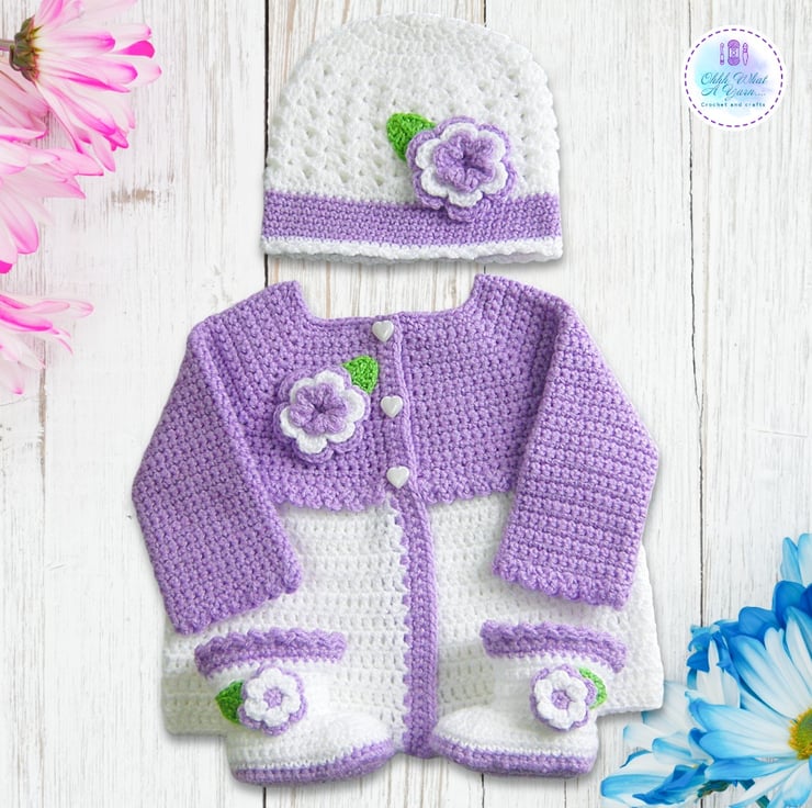 This pretty lilac and white crocheted cardigan, coat, jacket, hat and boots set is crocheted in 100% acrylic yarn and is a size 0-3 months and would be a lovely baby shower gift.