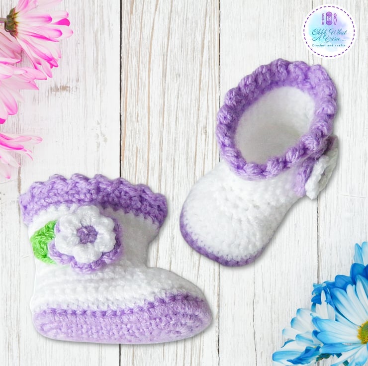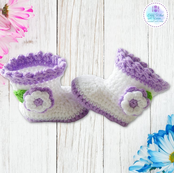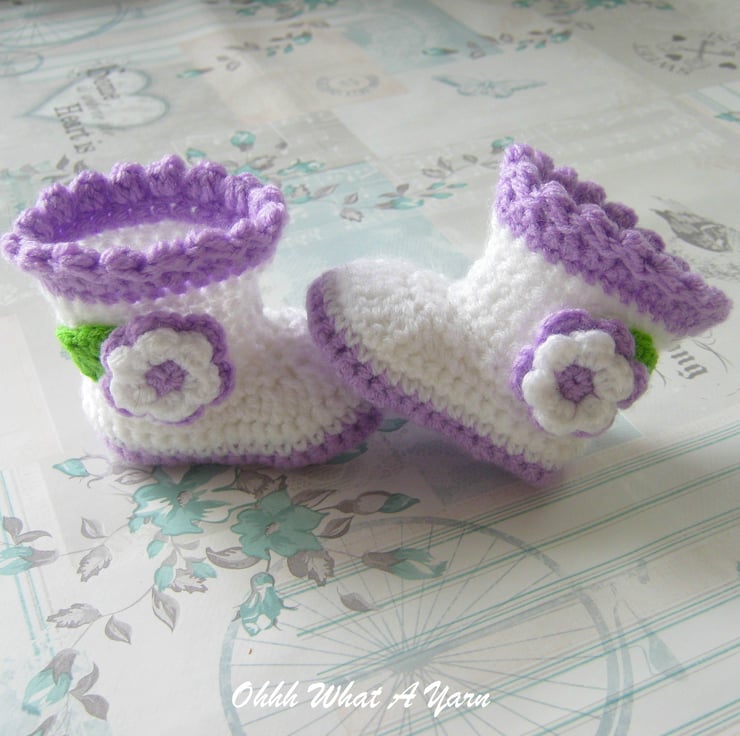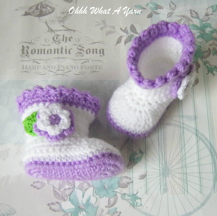 The little boots have lilac soles and white uppers and they are also decorated with crochet flowers and leaves and they have a lilac picot edging.