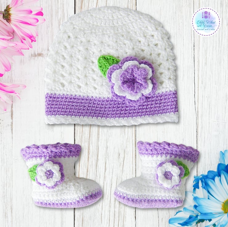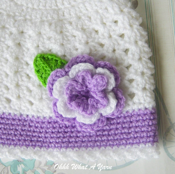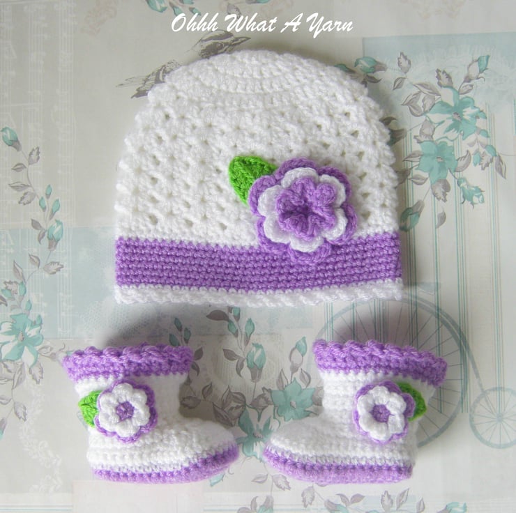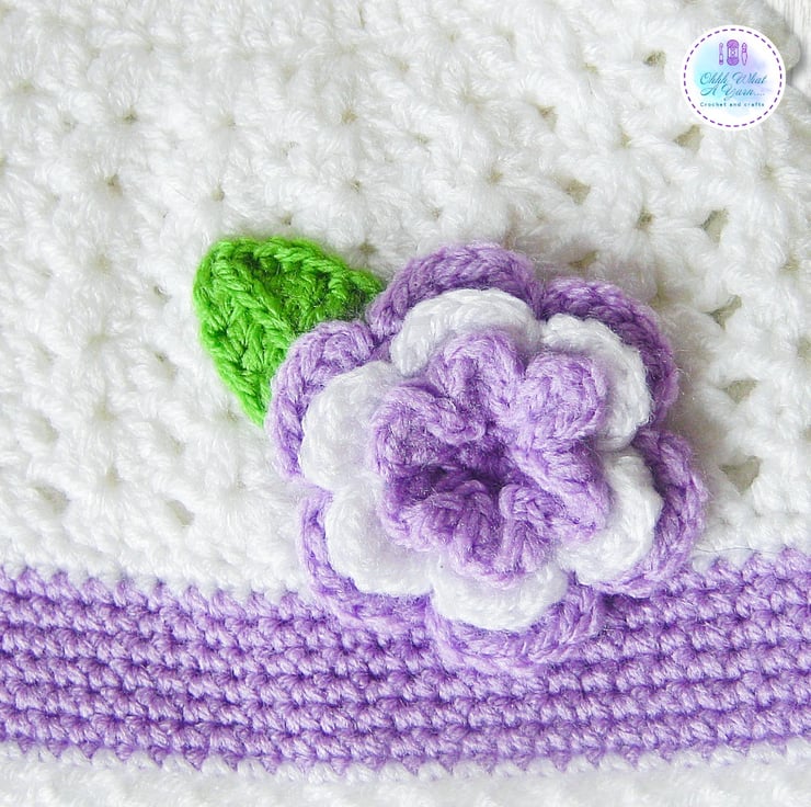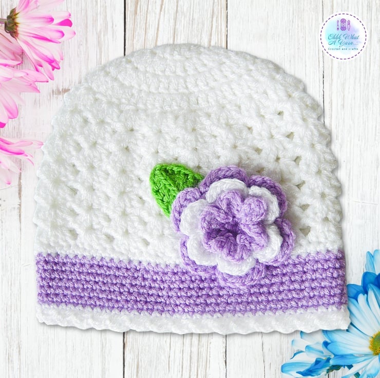 The matching hat is crocheted in white with a lovely lace pattern and it has a contrasting lilac band with a white frilly edging. The hat is also decorated with a three layered crochet flower and leaf.